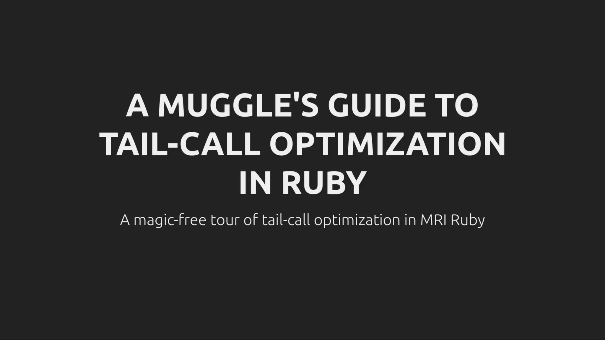 Submitted for your approval: a circle of torment unchronicled by the poets of old, a terror at the heart of many a horror story: SystemStackError: stack level too deep Tremble no more! Conquer the well of eternity! Behold the secrets of tail recursion and tail call optimization in Ruby! Witness the metamorphosis of a simple function as we explore the hidden power of tail call optimization buried deep within the Ruby VM! Follow the transformation to the revelation of tail call optimization's most ghastly secret: in many ways it's really just a special type of loop construct! The horror!
