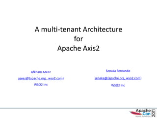A multi-tenant architecture allows Apache Axis2 to support multiple tenants. Axis2 uses contexts, descriptions, and a modular architecture to enable composability and isolate tenants. Tenants get their own classloaders to isolate services and modules. This allows different tenants to use different versions of libraries and modules.