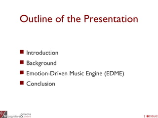 The document describes a musical system called the Emotion-Driven Music Engine (EDME) that is able to produce instrumental music with a specified emotional content. The system uses a hybrid approach that combines music selection/classification with music transformation. It was tested through experiments that evaluated its ability to accurately classify and transform music features related to emotional dimensions like valence and arousal. The results showed the system could reliably discriminate between emotions and produce emotionally expressive music, with contributions including its flexibility, reliability through experimental calibration, and adoption of both discrete and dimensional emotion representation.