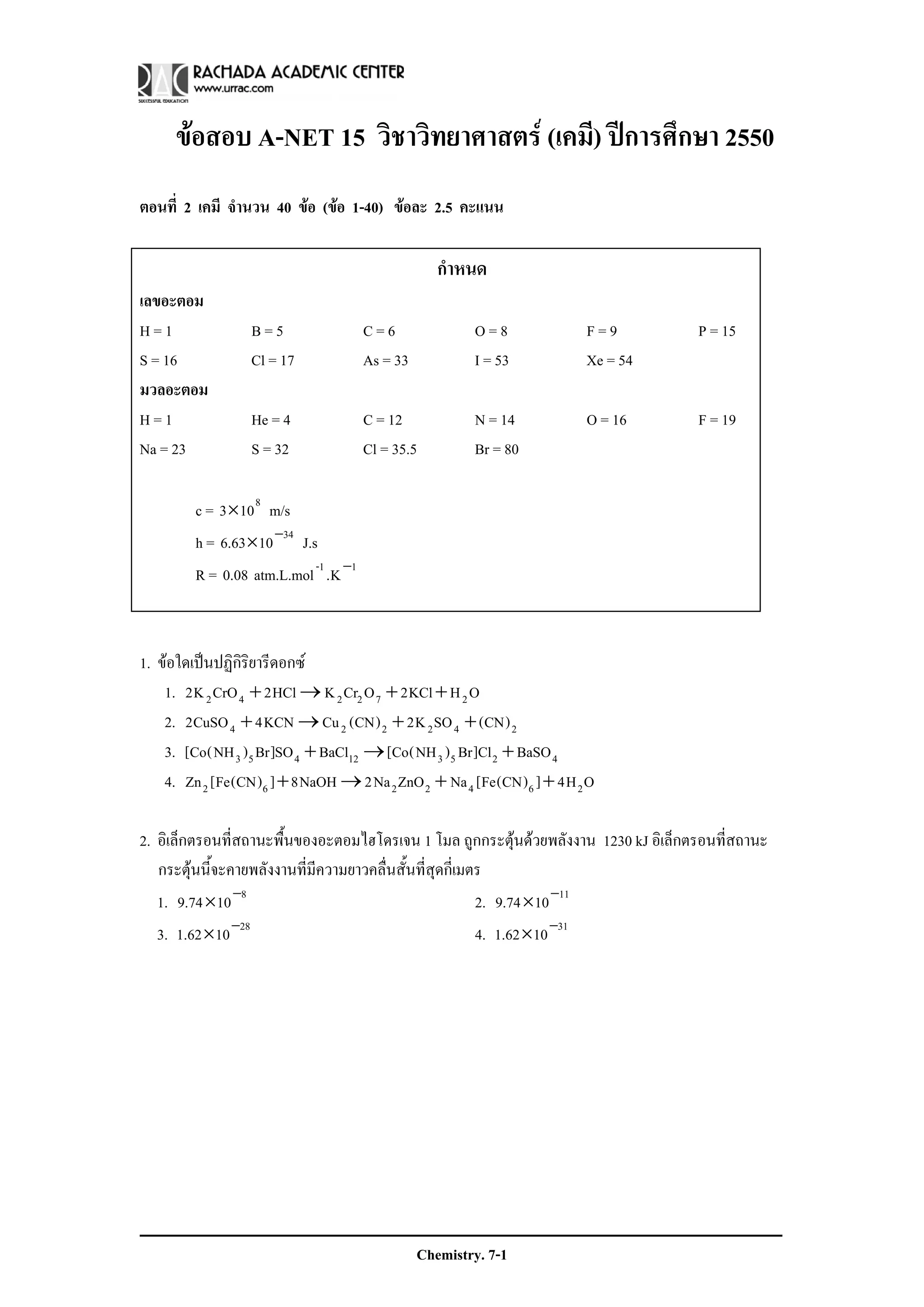 15 วิชาวิทยาศาสตร (เคมี) ปการศึกษา 2550 ตอนที่ 2 เคมี จํานวน 40 ขอ (ขอ 1-40) ขอละ 2.5 คะแนน กําหนด เลขอะตอม H = 1 B = 5 C = 6 O = 8 F = 9 P = 15 S = 16 Cl = 17 As = 33 I = 53 Xe = 54 มวลอะตอม H = 1 He = 4 C = 12 N = 14 O = 16 F = 19 Na = 23 S = 32 Cl = 35.5 Br = 80 c = m/s103 8 × h = J.s1063.6 34− × R = 1-1 K.atm.L.mol08.0 − 1. ขอใดเปนปฏิกิริยารีดอกซ 1. OHKCl2OCrKHCl2CrOK2 272242 ++→+ 2. 242224 )CN(SOK2)CN(CuKCN4CuSO2 ++→+ 3. 42532l453 BaSOCl]Br)NH(Co[BaClSO]Br)NH(Co[ +→+ 4. OH4])CN(Fe[NaZnONa2NaOH8])CN(Fe[Zn 2642262 ++→+ 2. อิเล็กตรอนที่สถานะพื้นของอะตอมไฮโดรเจน 1 โมล ถูกกระตุนดวยพลังงาน 1230 kJ อิเล็กตรอนที่สถานะ กระตุนนี้จะคายพลังงานที่มีความยาวคลื่นสั้นที่สุดกี่เมตร 1. 8 1074.9 − × 2. 11 1074.9 − × 3. 28 1062.1 − × 4. 31 1062.1 − ×
