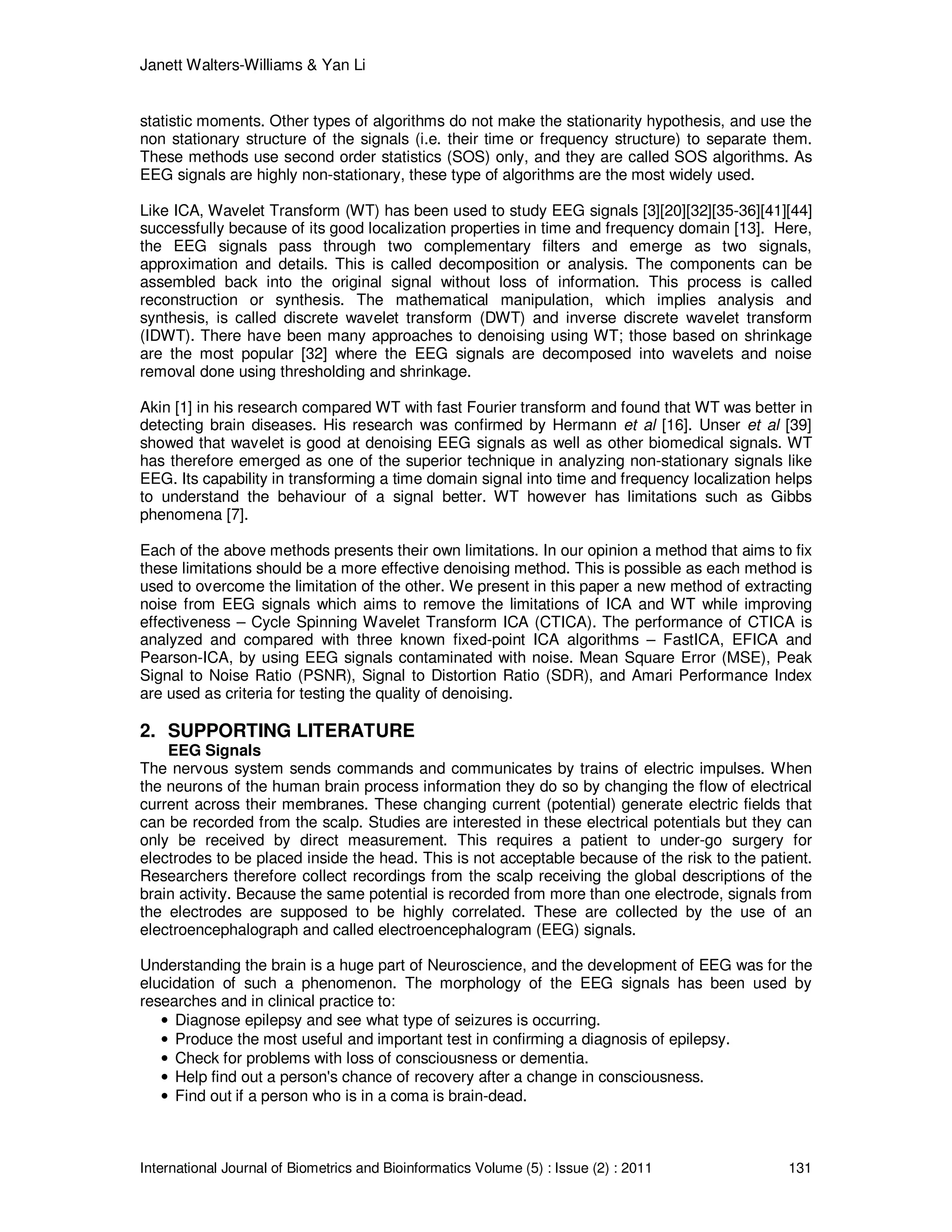 This paper introduces a novel algorithm that combines independent component analysis (ICA) and translation invariant wavelet transform to effectively denoise electroencephalogram (EEG) signals affected by noise. The proposed method, Cycle Spinning Wavelet Transform ICA (CTICA), outperforms conventional ICA techniques (FastICA, EFICA, and Pearson-ICA) in terms of mean square error, signal-to-noise ratio, and overall accuracy as demonstrated through experiments. This approach aims to address the limitations of existing denoising methods by leveraging the strengths of both ICA and wavelet transforms.