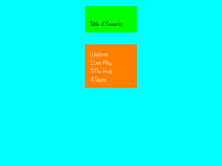 This document provides an introduction to the sport of basketball. It discusses the proper uniforms of a jersey, shorts, and sneakers. It explains some key aspects of playing basketball, such as dribbling the ball, rebounding missed shots, and making lay-ups. It describes the basketball hoop as the most important part of the court, as this is where baskets are scored. The document also briefly discusses the importance of teammates and not chatting with the opposing team when they have possession of the ball.