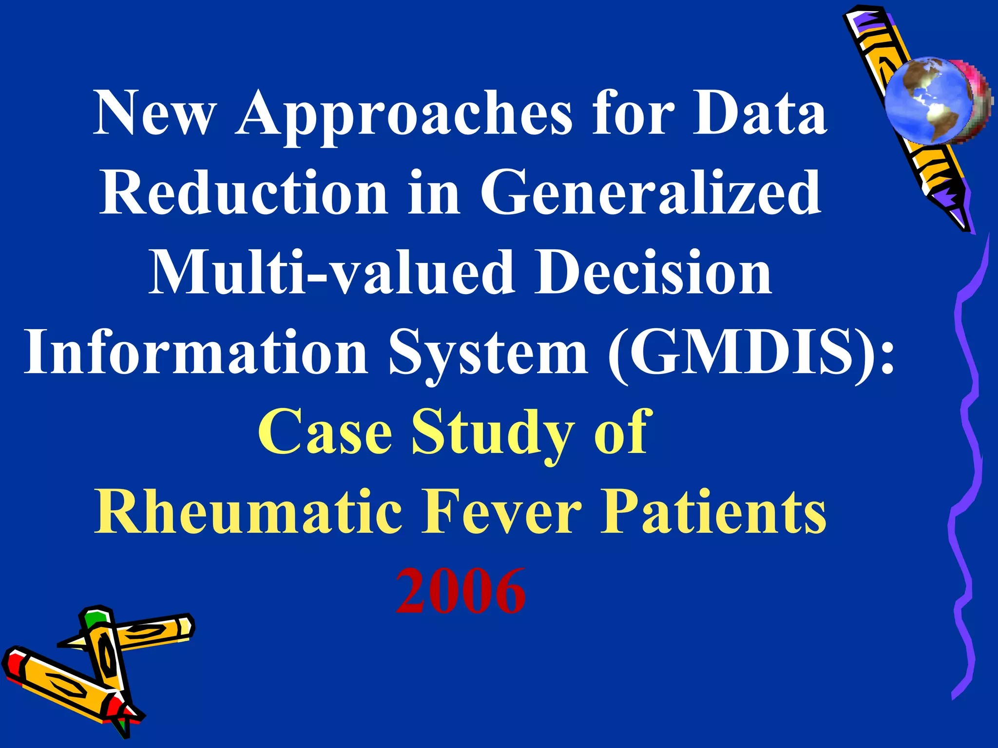 This document proposes new approaches for data reduction in generalized multi-valued decision information systems (GMDIS). It introduces the concept of GMDIS, which generalizes rough set theory to allow attributes to take set values. Two relations are defined on condition and decision attributes to form new equivalence classes for reduction. The degree of dependency between attributes is also studied. As a case study, rheumatic fever patient data is converted to a GMDIS and new reduct algorithms are applied. The results show the new approach provides a more refined reduction of the data compared to traditional rough set methods.