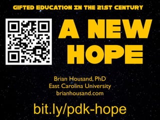 This document discusses gifted education in the 21st century and the need for change. It promotes incorporating technology, focusing on real-world problems, and developing skills like creativity, critical thinking, and communication. References are made to pioneers in gifted education from the past and promoting new literacies and a student-centered approach for the future of education.