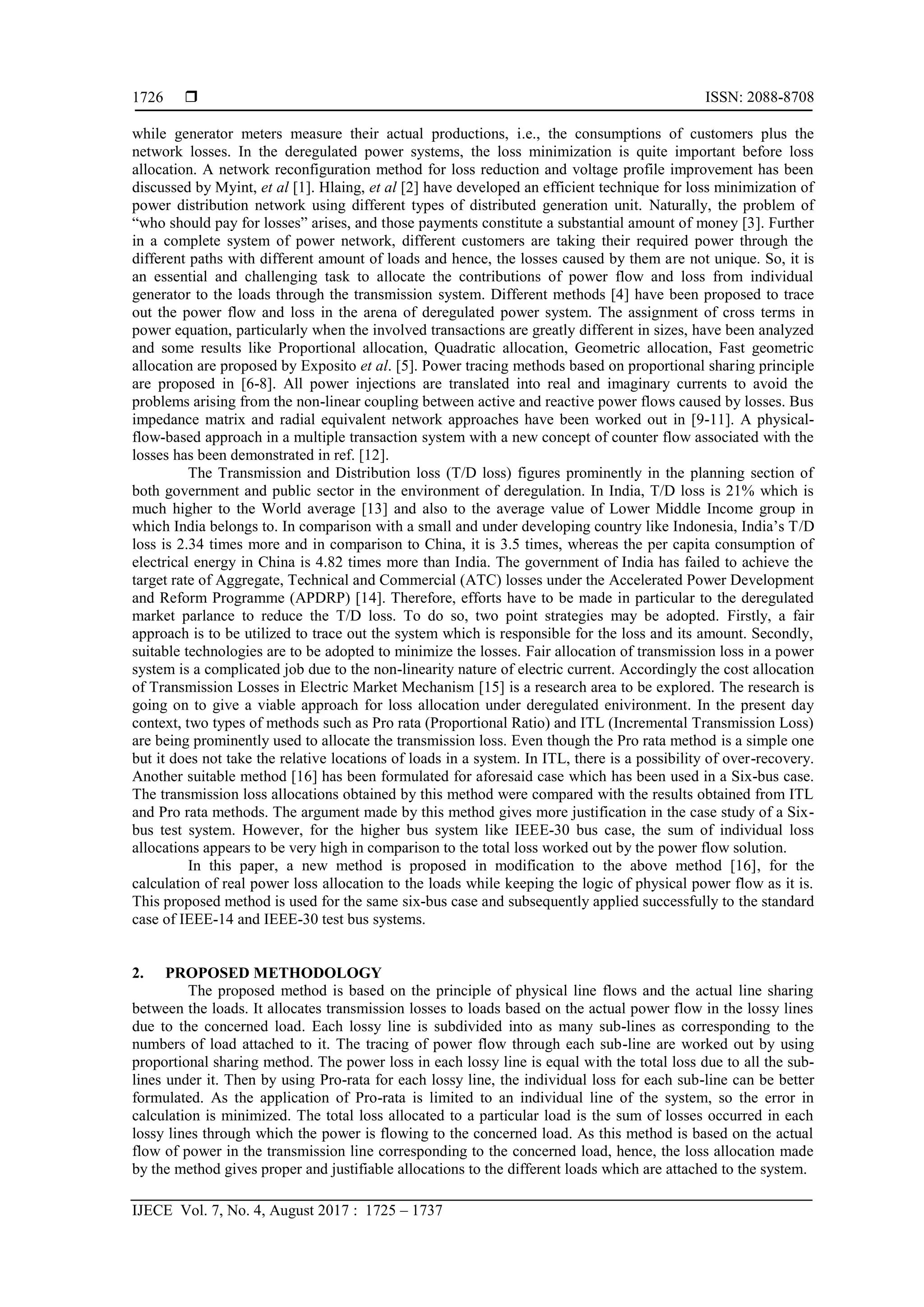 The document presents a new methodology for allocating active power transmission losses in deregulated power systems, addressing the challenges posed by the non-linear nature of power loss allocation. This method divides lossy transmission lines into sub-lines based on load connections and utilizes a proportional sharing technique to trace power flow, leading to a fair allocation of losses to the respective loads. The proposed method demonstrates improved accuracy over existing techniques when applied to various test systems, including a six-bus system and larger bus configurations.
