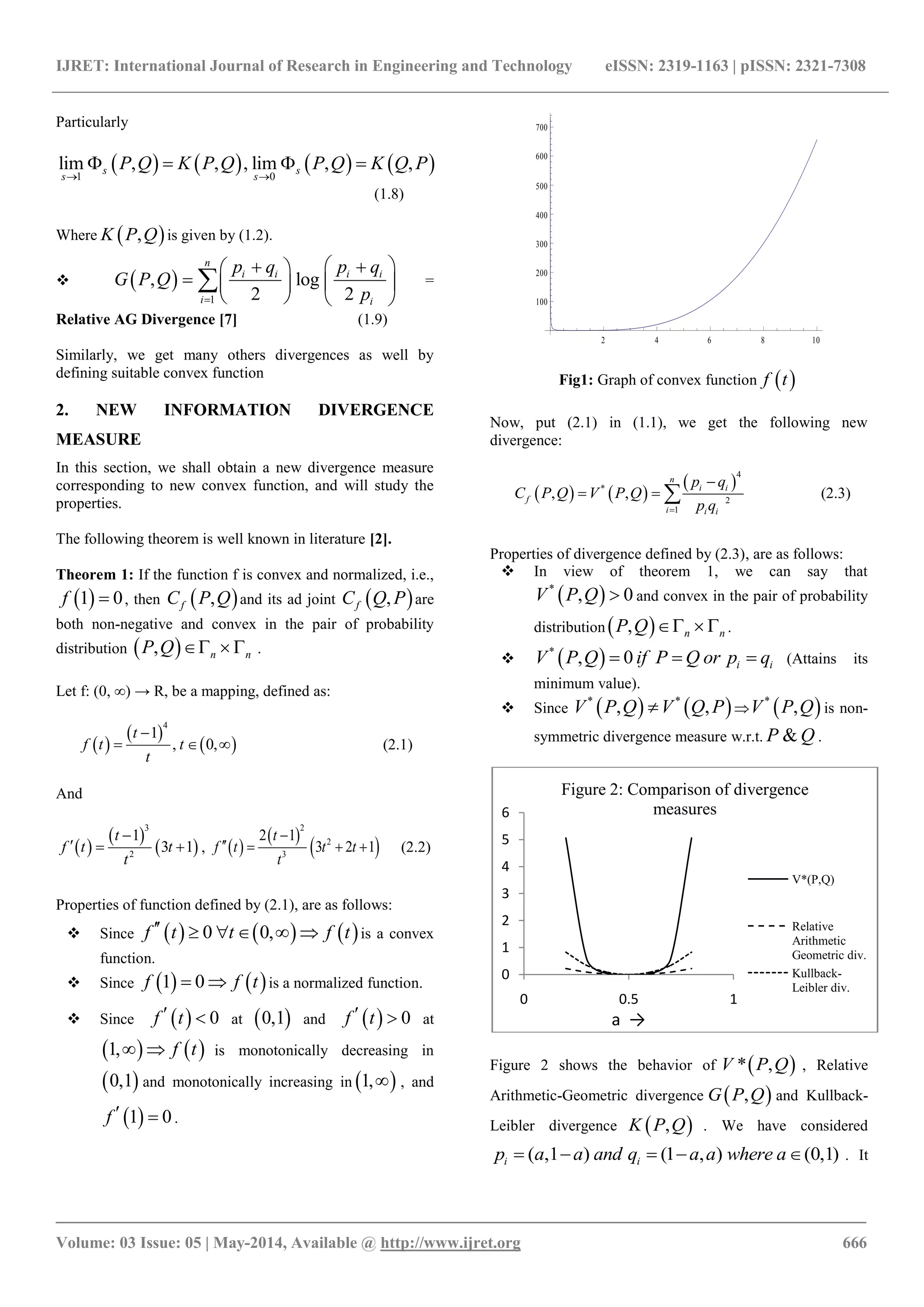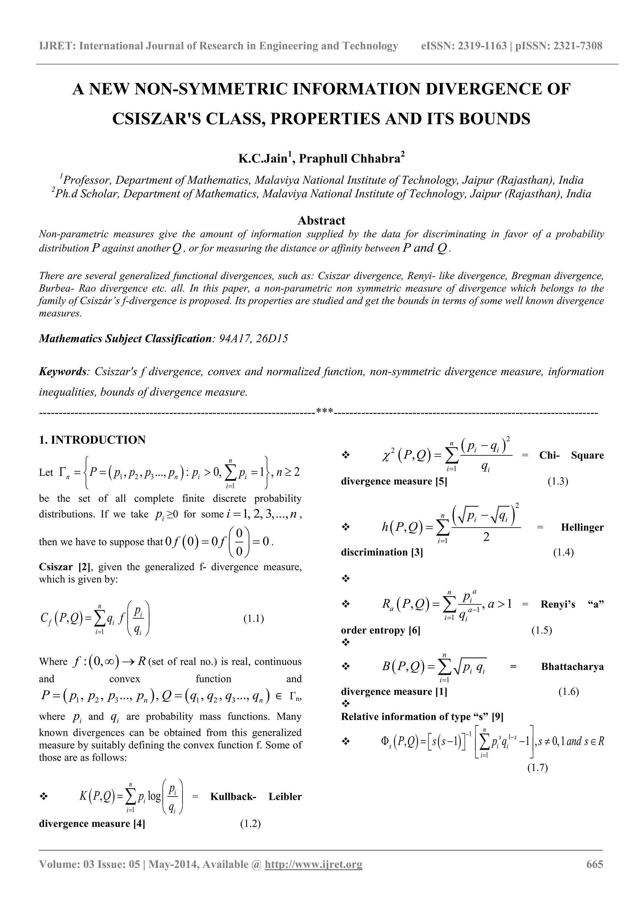 The document presents a new non-symmetric information divergence measure that belongs to the family of Csiszár's f-divergence. It discusses the properties and bounds of this measure in relation to well-known divergence measures such as Kullback-Leibler and Chi-square divergences. The authors also establish the convexity and normalization conditions under which this new divergence measure operates.