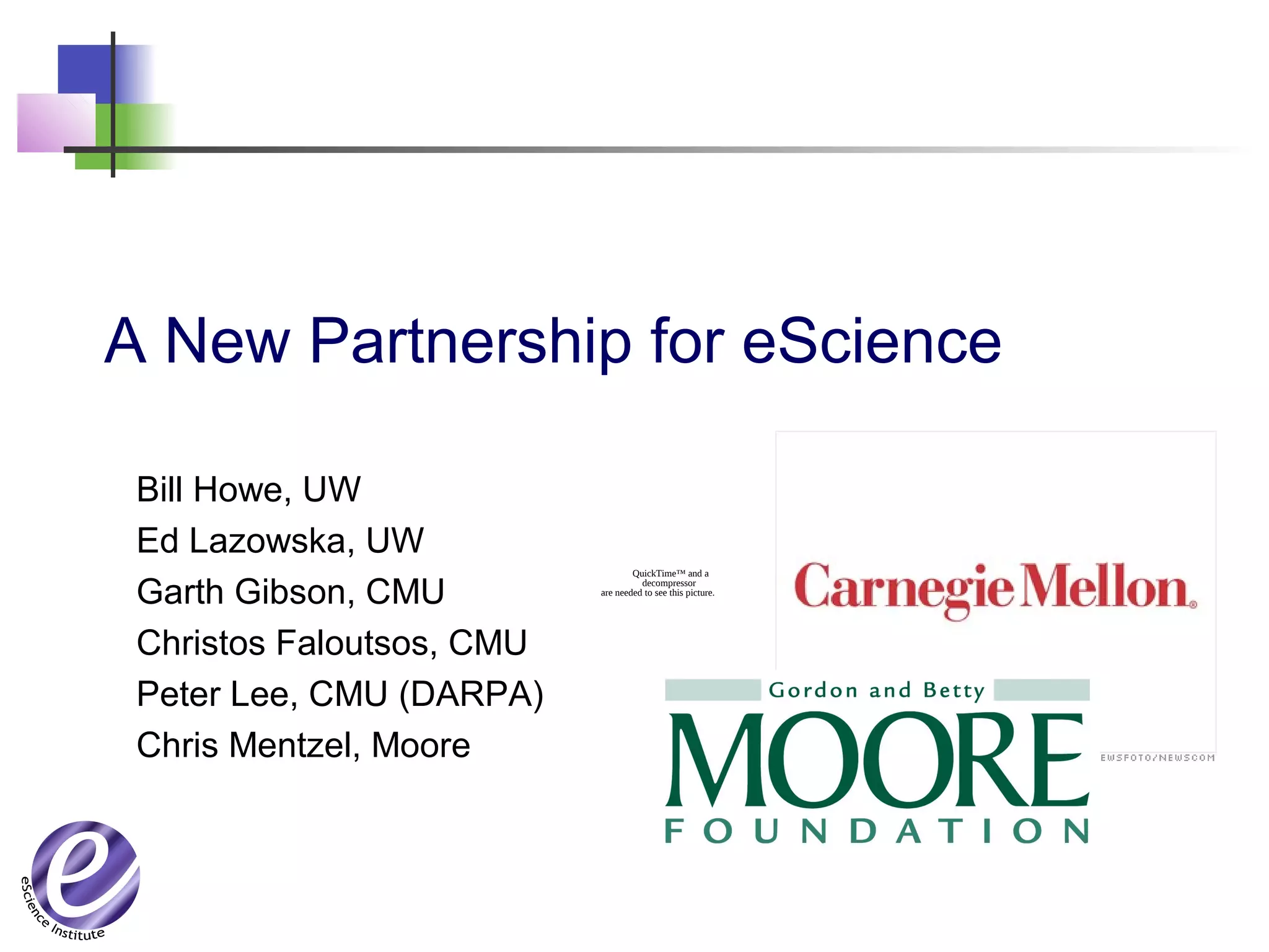 The document discusses the formation of a new partnership between the University of Washington and Carnegie Mellon University called the eScience Institute. The partnership will receive $1 million per year in funding from the state of Washington and $1.5 million from the Gordon and Betty Moore Foundation. The goal of the institute is to help universities stay competitive by positioning them at the forefront of modern techniques in data-intensive science fields like sensors, databases, and data mining.