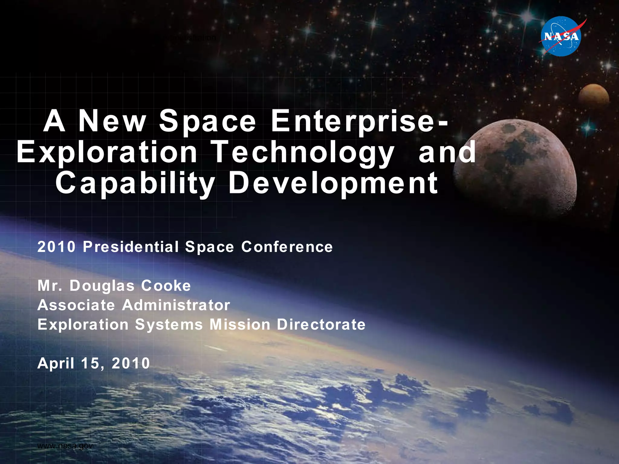 The document outlines the U.S. space exploration strategy as presented at the 2010 Presidential Space Conference, emphasizing technology development for future human missions beyond low Earth orbit. Key areas of focus include advanced propulsion, autonomous systems, life support, and biomedical research, with an emphasis on partnerships between government and education to engage the public in space science. The strategy includes investments in innovative technologies to support missions to the Moon, asteroids, and Mars, aiming to expand human presence in the solar system.