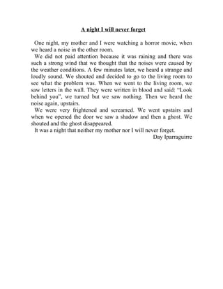 A mother and daughter heard strange noises while watching a horror movie during a stormy night. When they went to investigate loud sounds in the living room, they discovered a frightening message written in blood on the wall that said "Look behind you." They then heard more noises coming from upstairs and found a ghostly shadow when they opened the bedroom door. It was a night they would never forget.