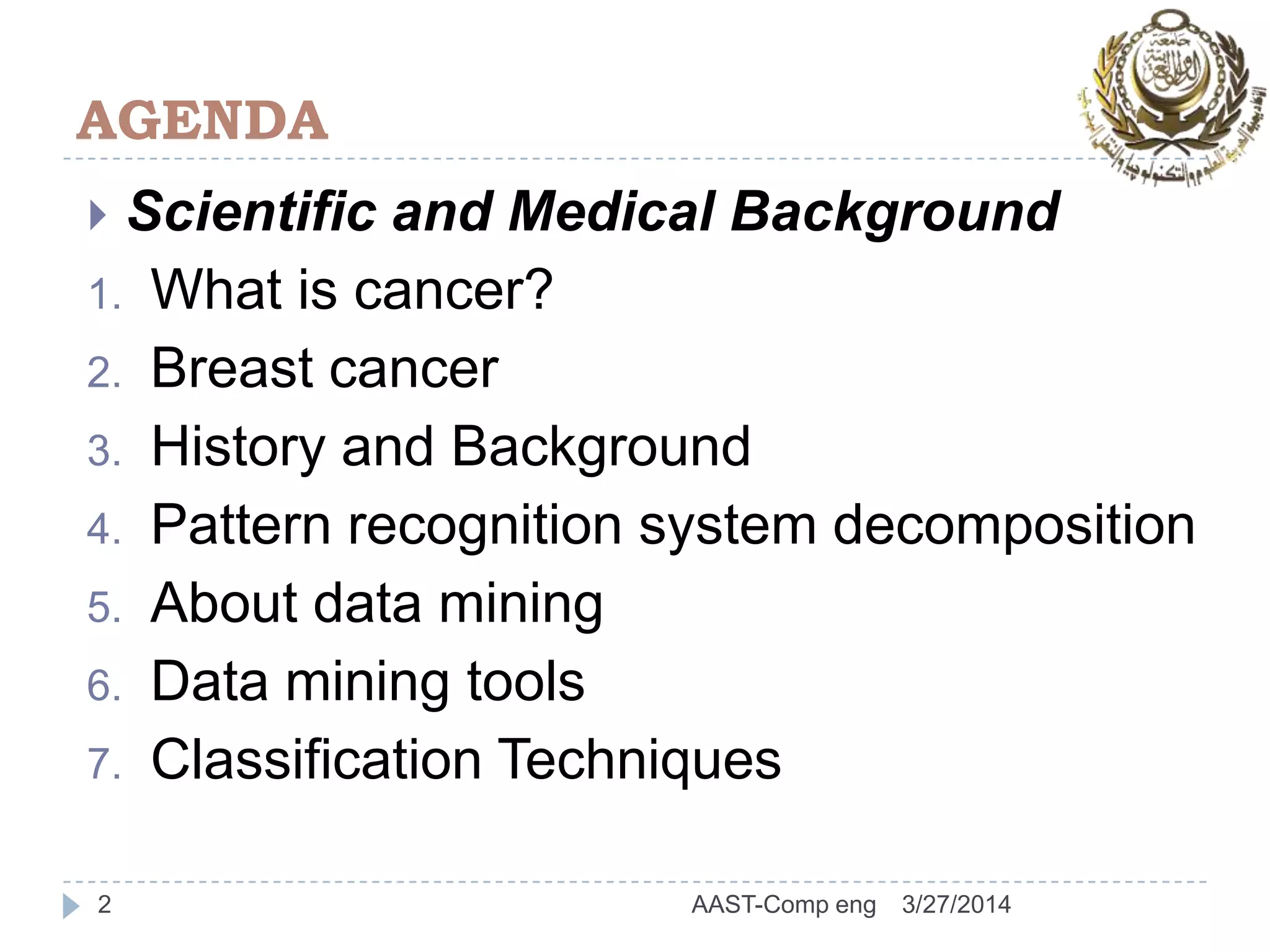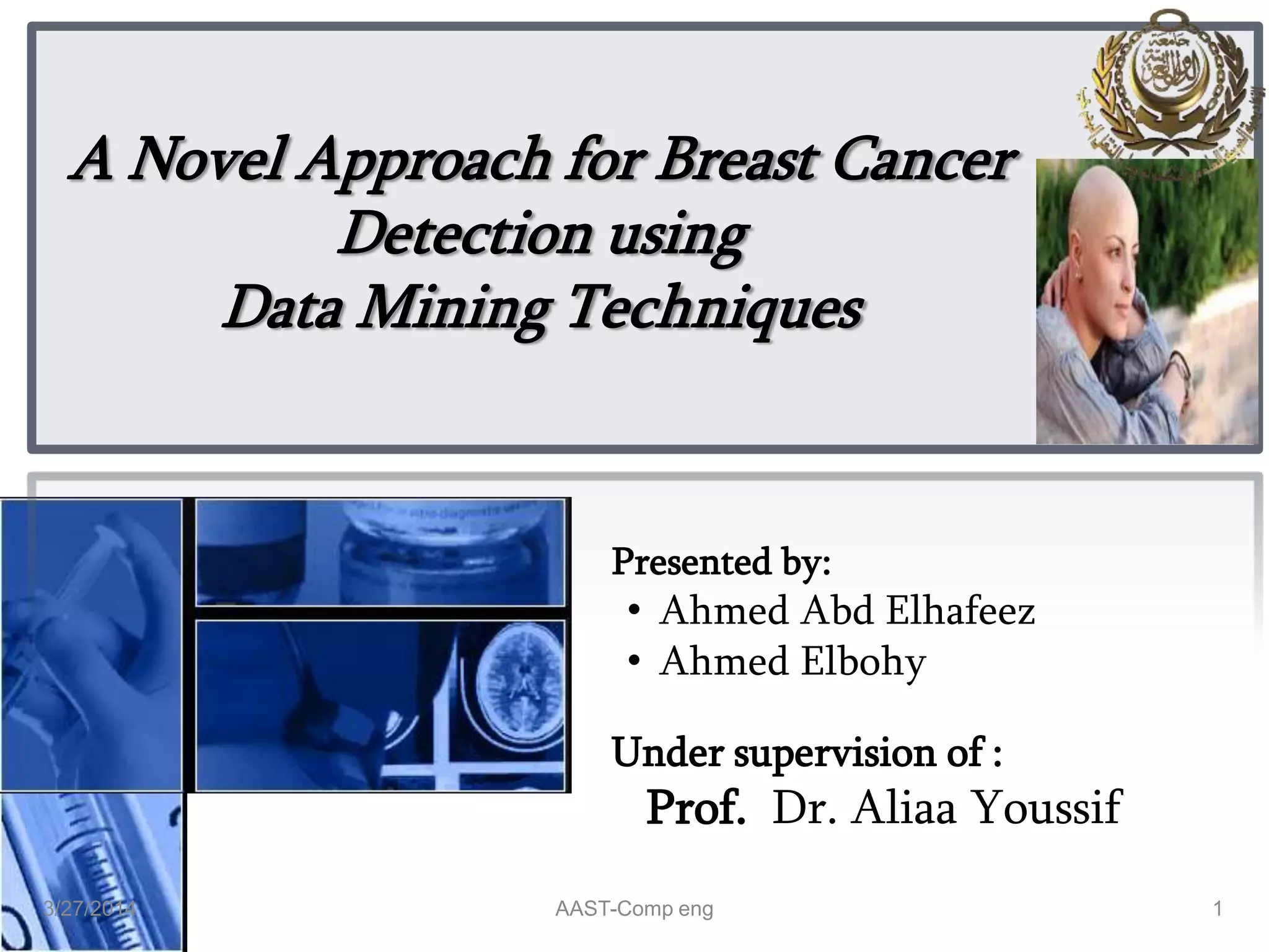 This document presents a novel approach to breast cancer detection using data mining techniques, highlighting its significance as a prevalent disease impacting women's health globally. It discusses various classification techniques and the use of data mining tools to improve diagnosis accuracy, as well as the importance of sensitivity and specificity in patient prognosis. The document emphasizes advancements in computational intelligence and machine learning methods like Support Vector Machines and k-nearest neighbors for effective cancer classification.
