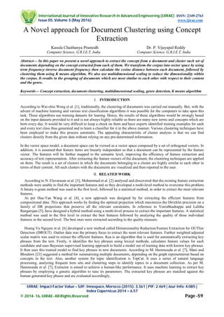 The paper proposes a novel method for document clustering by extracting concepts from documents, transforming them into vector space using TF-IDF, and employing the k-means algorithm for clustering. It highlights the importance of feature extraction and presents a workflow involving stop word removal, stemming, cosine similarity calculation, and visualization of document clusters. The study utilizes a corpus of articles from the Pocket application, aiming to categorize documents by genre based on their content similarity.