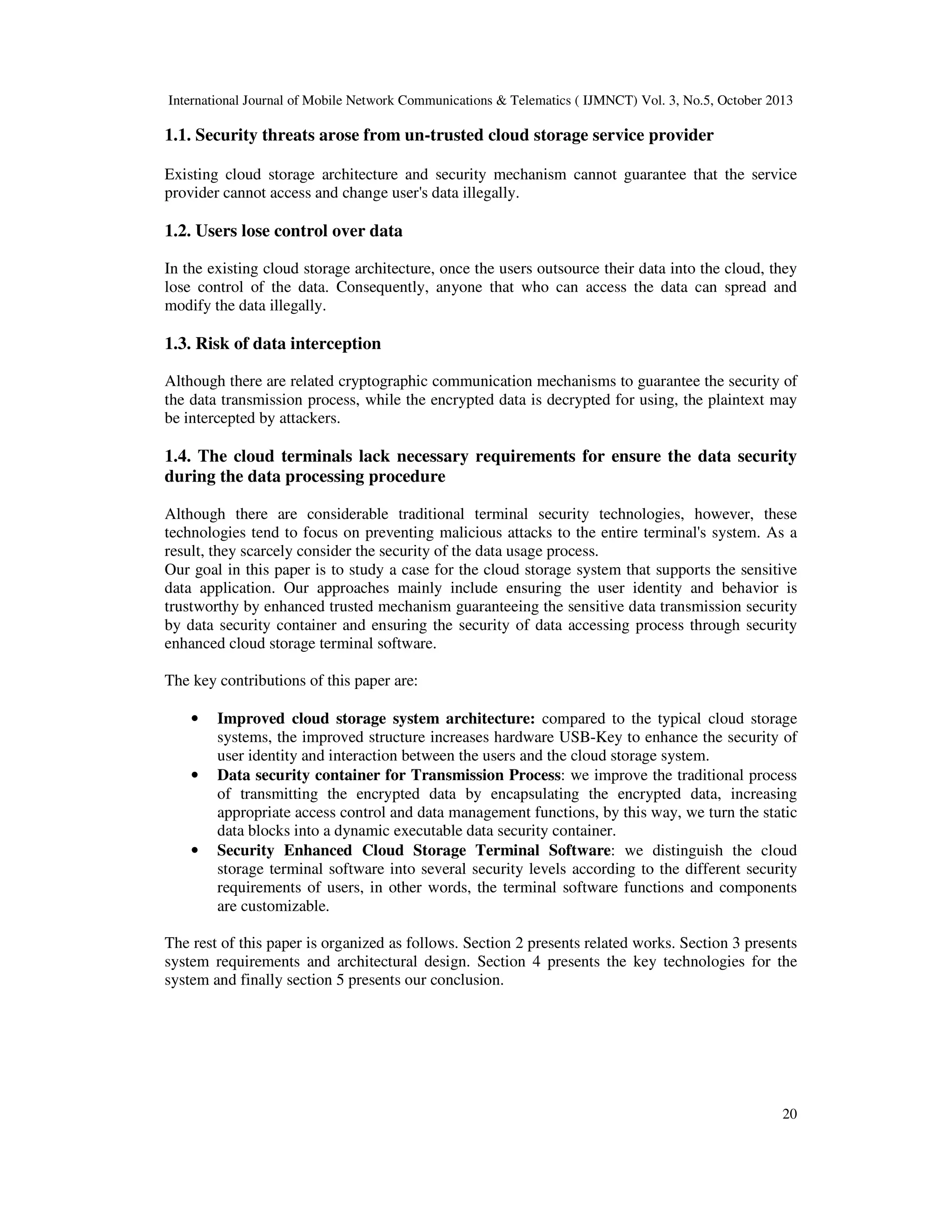 The paper proposes an improved architecture for cloud storage systems that addresses security concerns related to sensitive data applications. It introduces enhancements such as a hardware USB key for user identity security and a data security container to secure the transmission of encrypted data. Additionally, the architecture allows for customizable cloud storage terminal software tailored to specific user security requirements.