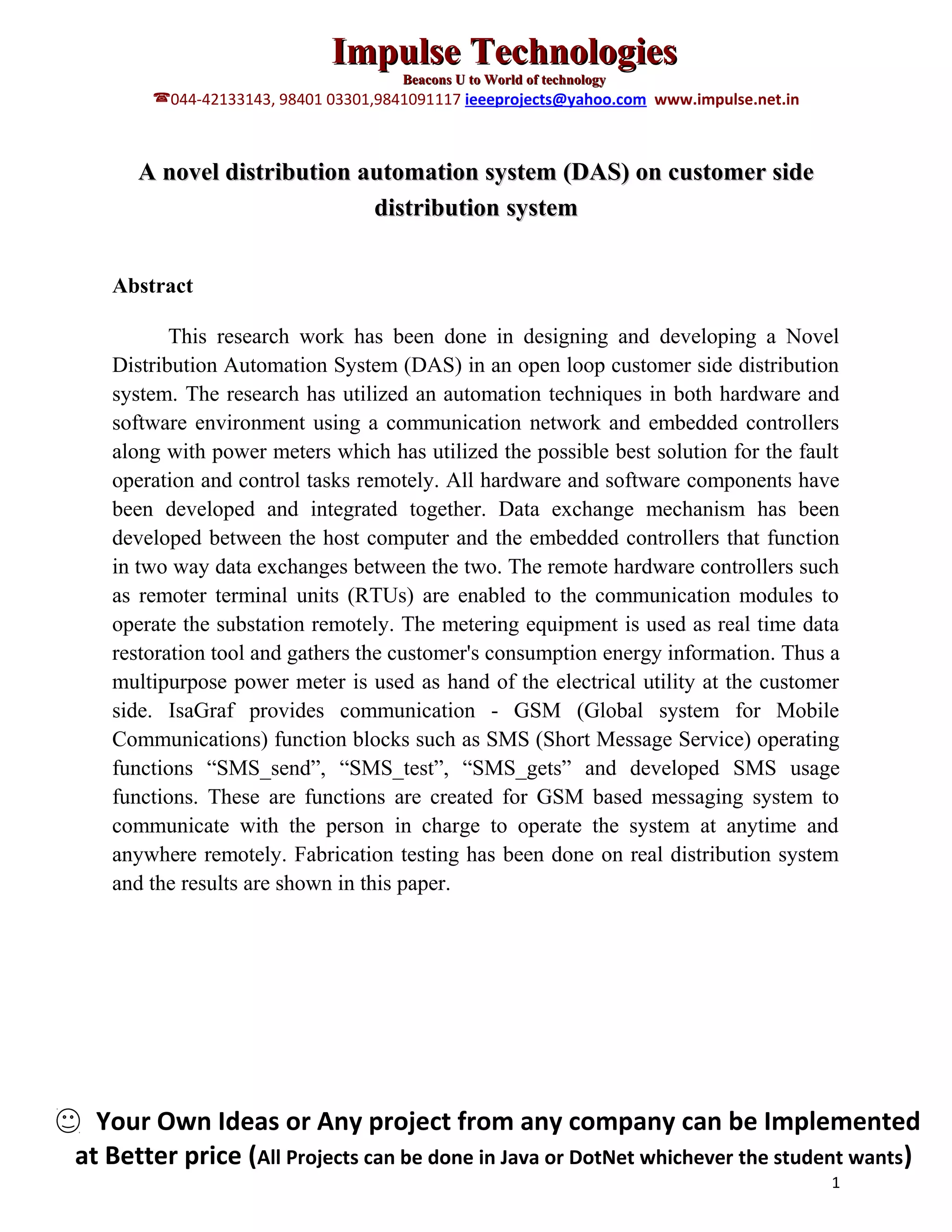 This document describes a novel distribution automation system for customer-side power distribution that was designed and developed using automation techniques in both hardware and software. Remote controllers and smart meters allow the electrical utility to monitor and operate the substation remotely via a communication network. A multipurpose power meter gathers customer energy consumption data. The system utilizes GSM functionality to allow remote operation and messaging via SMS from anywhere. Testing of the system on a real distribution network demonstrated successful remote operation and control.