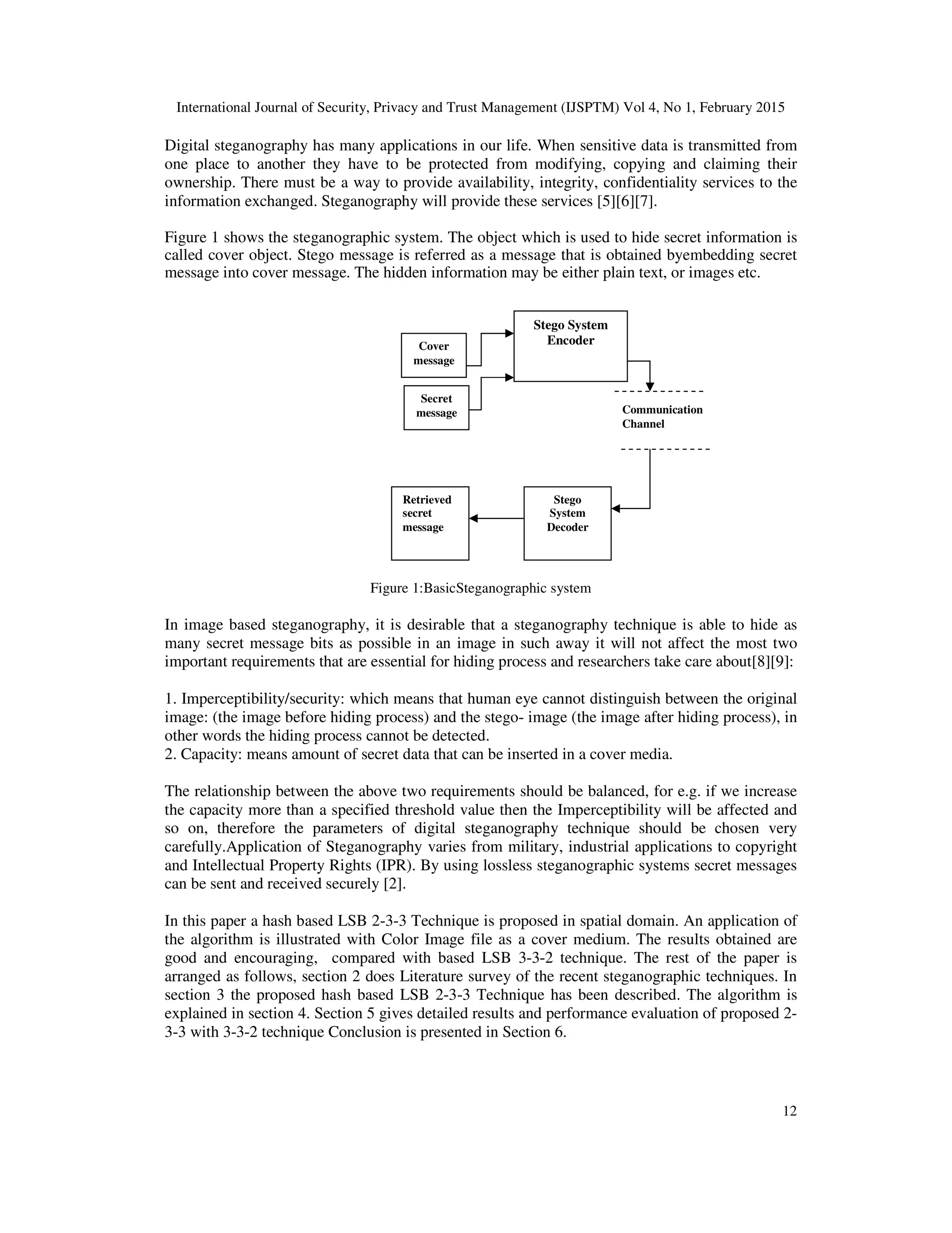 The document presents a novel hash-based 2-3-3 least significant bit (LSB) image steganography technique for embedding secret images in the spatial domain of color cover images. The technique embeds 8 bits of secret image data at a time in the LSBs of color image pixels in a 2-3-3 pattern across the red, green, and blue channels. Experimental results show the proposed 2-3-3 technique improves mean squared error and peak signal-to-noise ratio values compared to the base 3-3-2 LSB insertion technique. The proposed technique provides better imperceptibility of the stego image and higher embedding capacity than previous hash-based LSB methods.