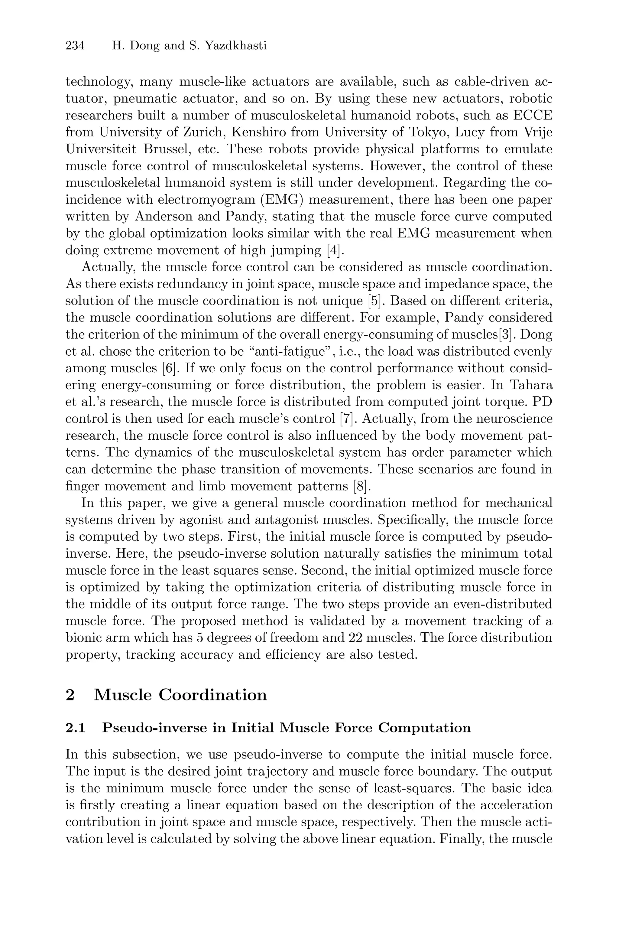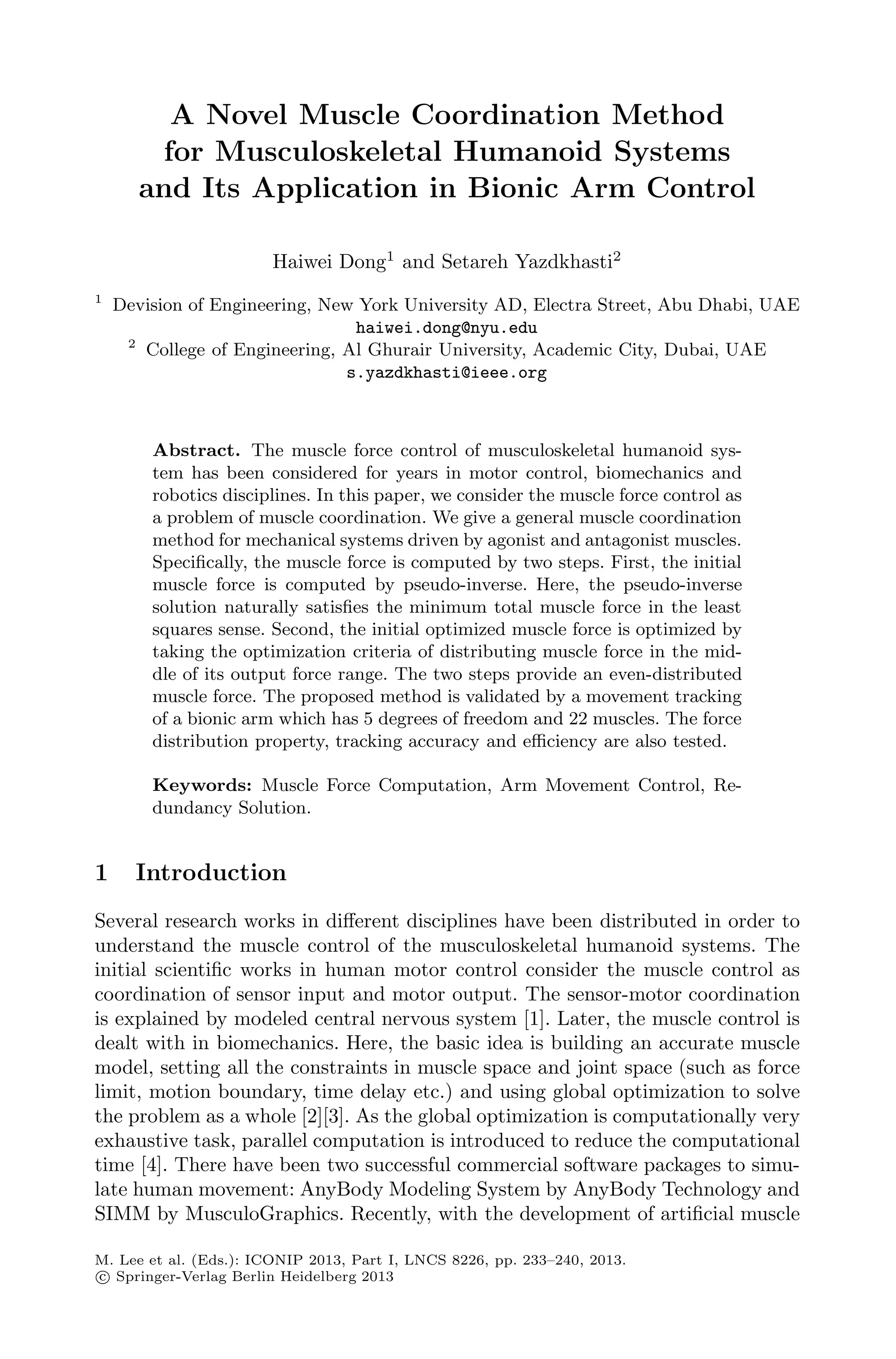 This document proposes a novel two-step muscle coordination method for controlling musculoskeletal humanoid systems. The first step uses pseudoinverse to compute an initial minimum muscle force solution. The second step optimizes the initial solution using gradient descent to more evenly distribute muscle forces within their output ranges. The method is validated using a bionic arm model with 5 degrees of freedom and 22 muscles, demonstrating good force distribution, tracking accuracy, and efficiency.