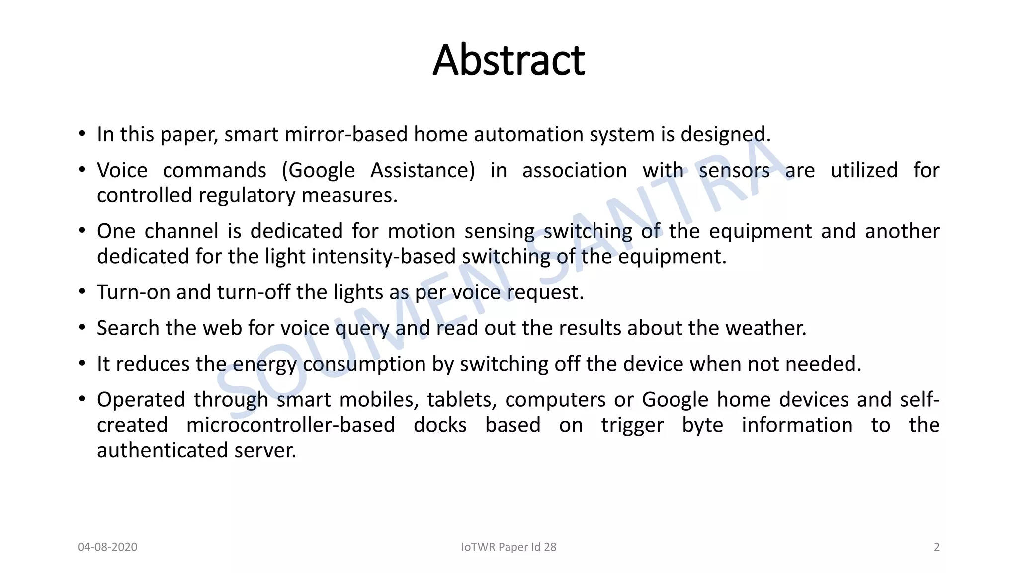This document presents a novel real-time home automation system utilizing Google Assistant technology, designed for operation via voice commands and equipped with various sensors. It aims to provide a cost-effective, user-friendly solution for controlling home appliances, particularly benefiting elderly and disabled individuals. The system incorporates smart devices, microcontrollers, and applications such as IFTTT and Blynk, ensuring energy efficiency and ease of use.