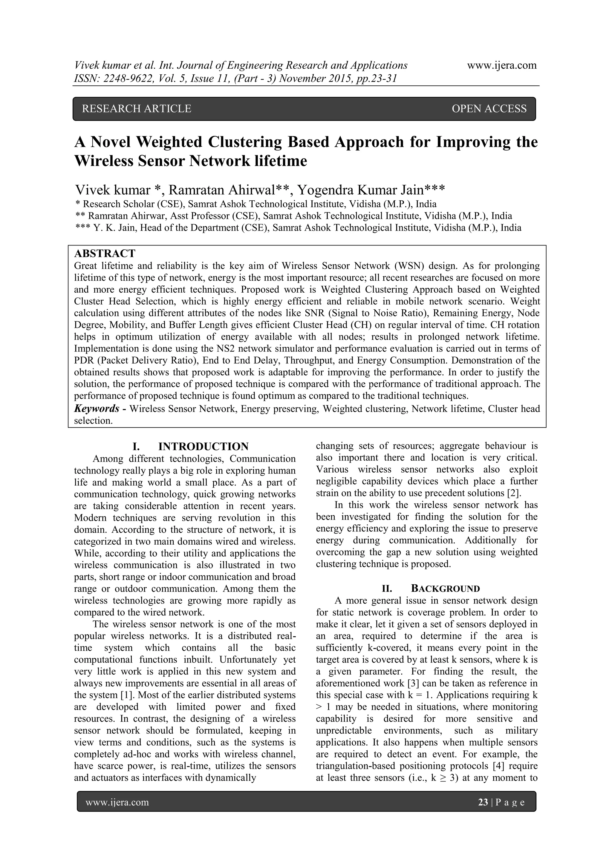 The document presents a novel weighted clustering approach to enhance the lifetime and reliability of wireless sensor networks (WSNs) by optimizing energy usage through dynamic selection of cluster heads based on multiple node attributes. The method aims to utilize all available energy resources effectively, thus preventing network failure due to energy depletion. Performance evaluations using simulation demonstrate that the proposed technique offers significant improvements over traditional clustering methods in terms of packet delivery ratio, end-to-end delay, throughput, and energy consumption.
