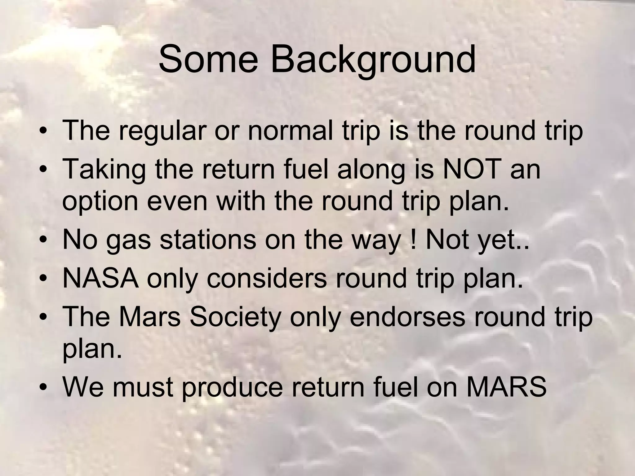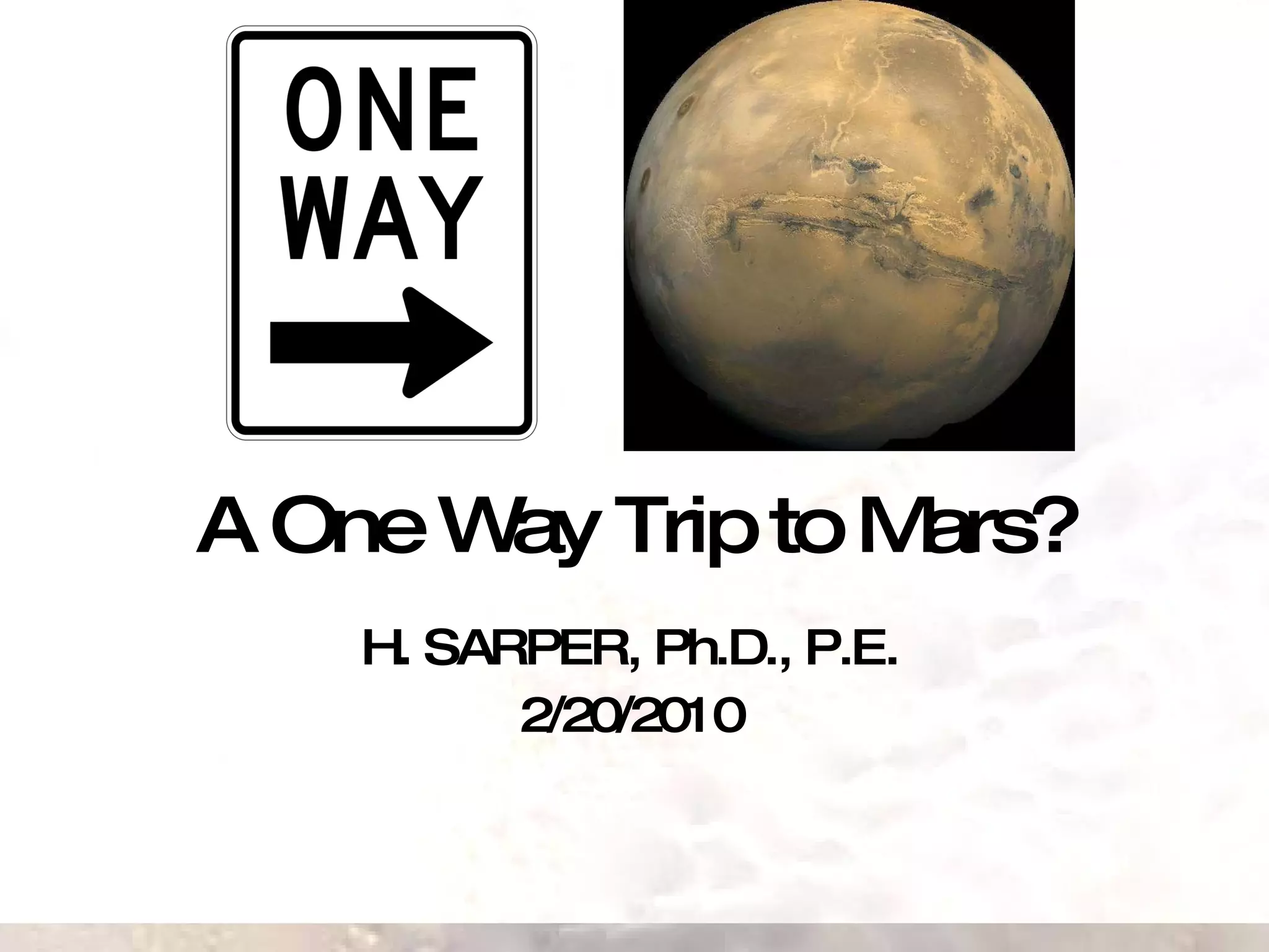 The document discusses proposals for a one-way human mission to Mars that would establish a permanent human presence without the capability to return to Earth. It outlines a plan to produce return fuel on Mars through in-situ resource utilization to convert Martian atmospheric CO2 and hydrogen brought from Earth into methane and oxygen rocket fuel. While some argue a one-way mission could reduce costs and risks, the document assesses that the total cost savings may be limited and risks are not necessarily lower given the long-term challenges of maintaining humans on Mars indefinitely. An alternative architecture is proposed using electric tugs to transport cargo prior to crew arrival in order to reduce payload sizes and risks of entry, descent, and landing.