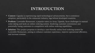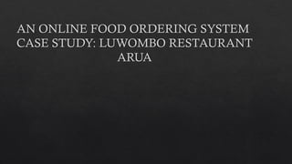 The document presents a case study on developing an online food ordering system for Luwombo restaurant in Arua, Uganda, addressing its challenges with manual order-taking that hinder customer convenience and competitiveness. The study aims to enhance customer experience, improve operational efficiency, and potentially increase revenue through a user-friendly web application accessible via various devices. The methodology includes quantitative research, system design, and extensive testing to ensure the new system meets user requirements and expectations.