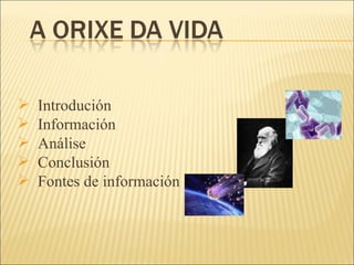 A continuación trataremosde explicar as distintas teorías sobre a orixe da vida que tuberon lugar ao longo da historia e como evolucionaron dende un pensamento relixioso ata un punto de vista científico.