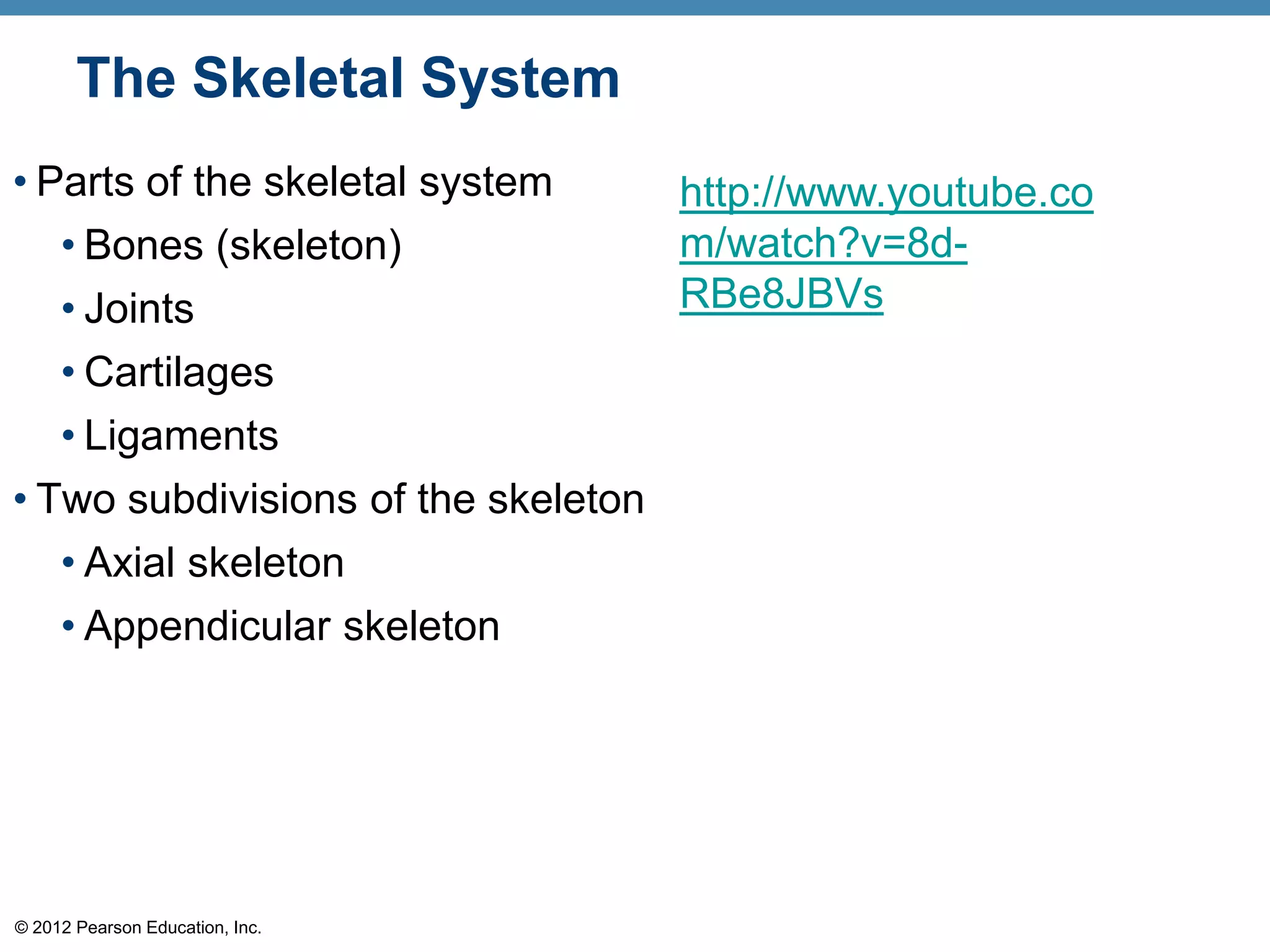 The skeletal system consists of bones, joints, and cartilages that make up the endoskeleton of the human body. It has several functions including support, protection, movement, mineral storage, and blood cell formation. The skeletal system is divided into the axial skeleton which includes the skull, vertebral column, and chest, and the appendicular skeleton which connects to the axial skeleton and includes the upper and lower limbs. Bones can be classified based on their shape as long, short, flat, or irregular. The anatomy of long bones includes diaphyses, epiphyses, periosteum, marrow cavity, and growth plates. Joints allow movement and come in several types including ball-and-socket and