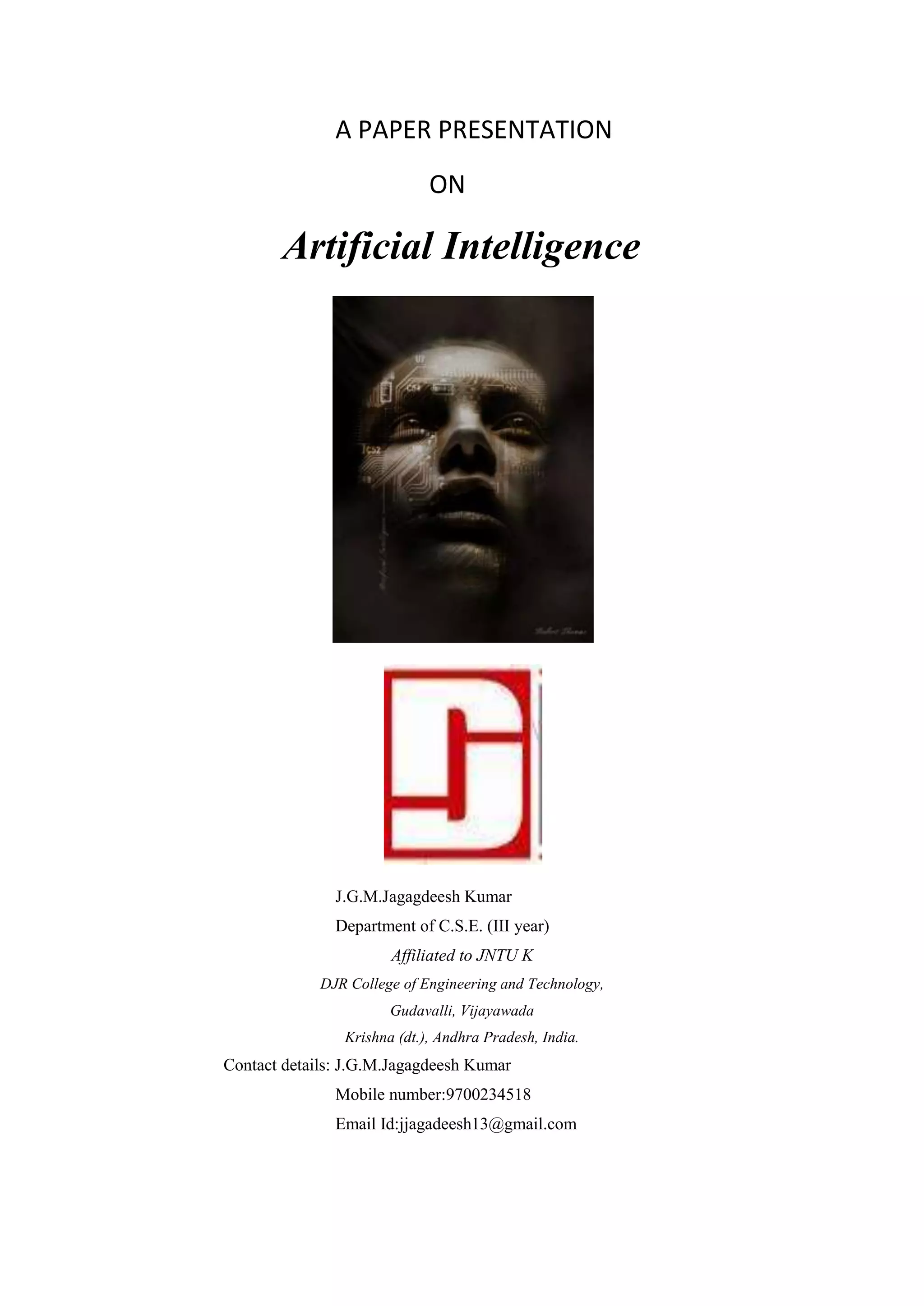 This document is a paper presentation on artificial intelligence by J.G.M.Jagagdeesh Kumar from DJR College of Engineering and Technology in Vijayawada, India. The paper discusses the history and goals of artificial intelligence, including creating systems that think like humans through the Turing test and systems that think rationally. It also examines different definitions of AI and the tension between modeling human and rational thought.