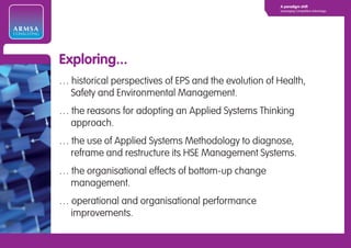 The document discusses transforming an organization's occupational health and safety management system (OH&SMS) using an applied systems thinking approach. It explores the historical perspectives of health, safety and environmental management at the organization. It then discusses diagnosing the current system using systems analysis and redesigning it using an interactive planning process that involves stakeholders to better align the OH&SMS with business goals and improve performance. The transformation led to improved department integration, risk control, and staff engagement in the OH&SMS.