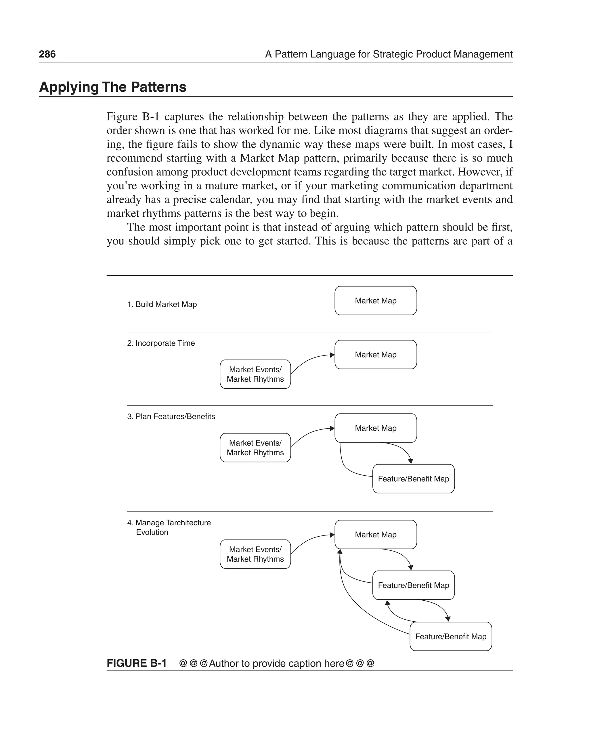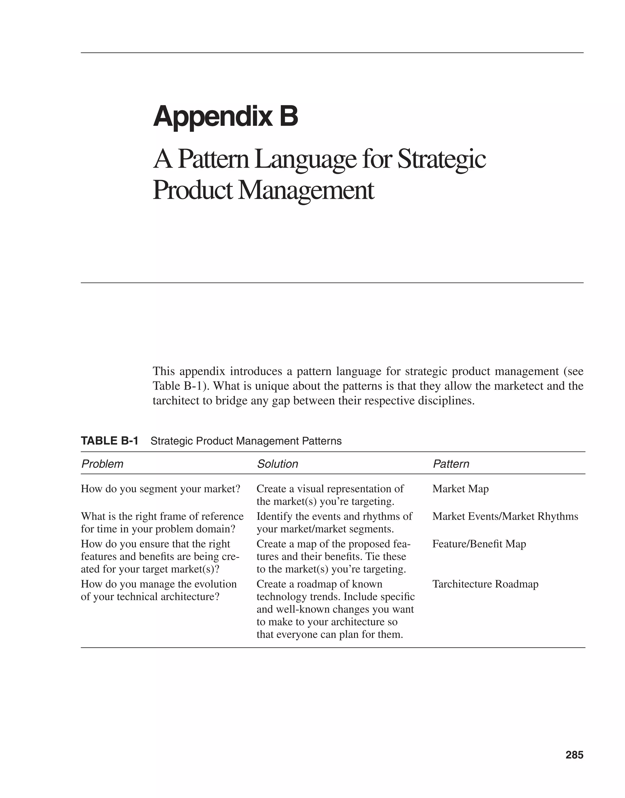 This appendix introduces a pattern language for strategic product management aimed at bridging gaps between market architecture and technical architecture. It discusses key patterns such as market segmentation, feature/benefit mapping, and technology roadmapping to enhance product development processes by ensuring alignment of features with market needs and managing technological evolution. The document emphasizes iterative mapping and the importance of feedback loops in adapting strategies to market changes.