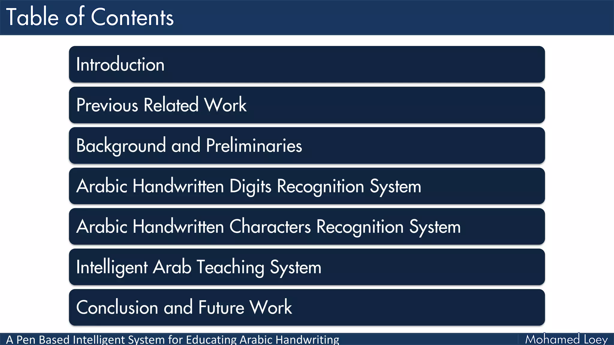 The document discusses the development of a pen-based intelligent system aimed at teaching Arabic handwriting, focusing on recognizing Arabic characters and digits through deep learning architectures like convolutional neural networks and stacked autoencoders. The main objectives include creating an intelligent tutoring system that provides immediate feedback to preschool children on their handwriting difficulties. The research highlights the effectiveness of these methods in error detection and classification while discussing experimental results and future considerations for improvement.