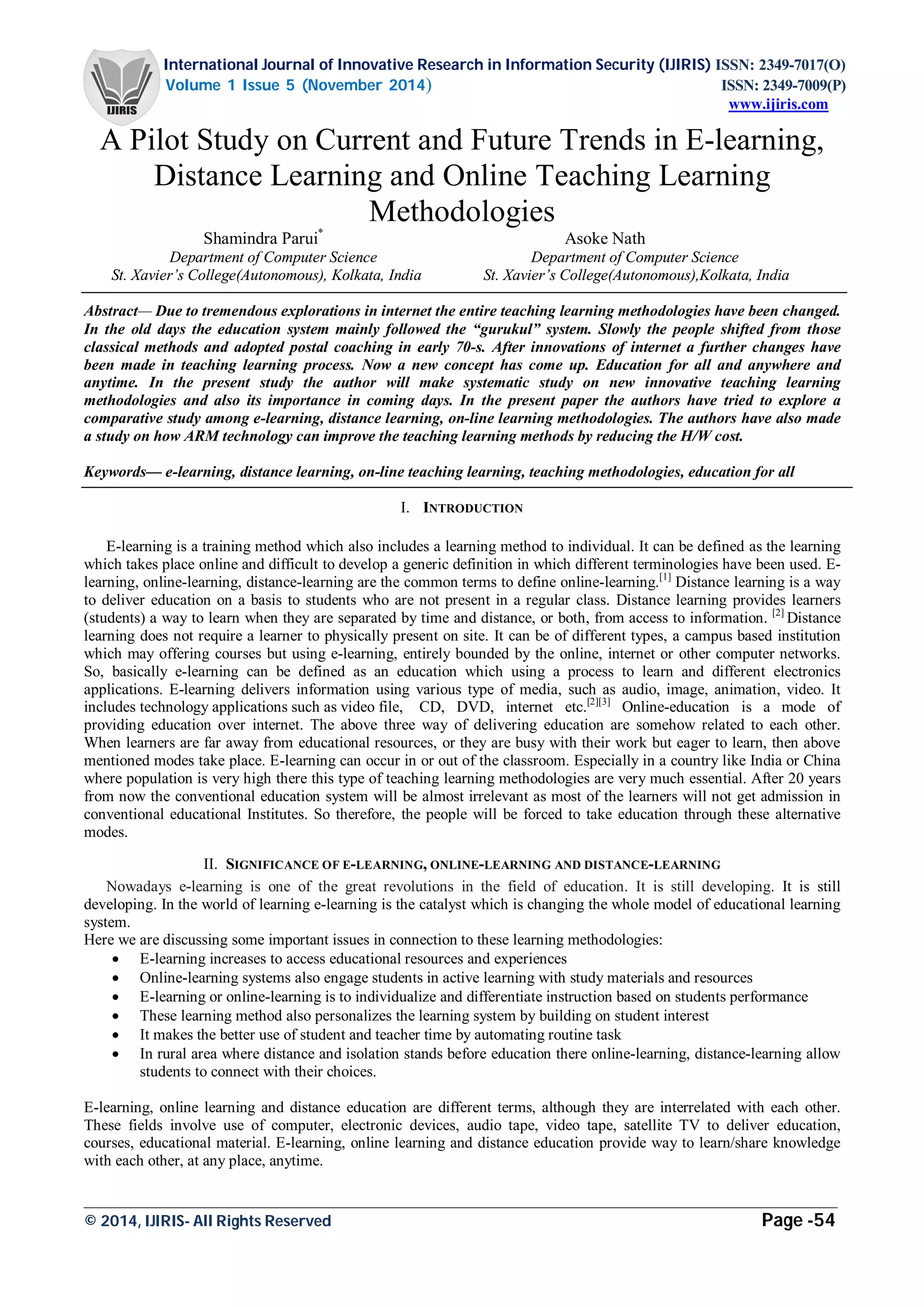 This document presents a pilot study on the evolving methodologies in e-learning, distance learning, and online teaching, highlighting the shift from traditional education systems to more accessible, technology-driven models. It discusses the significance, benefits, and components of these learning methodologies, emphasizing their interrelatedness and the necessity of technology in facilitating education. The authors predict that conventional education systems will decline in relevance, necessitating the adoption of innovative learning approaches to accommodate a growing population's educational needs.