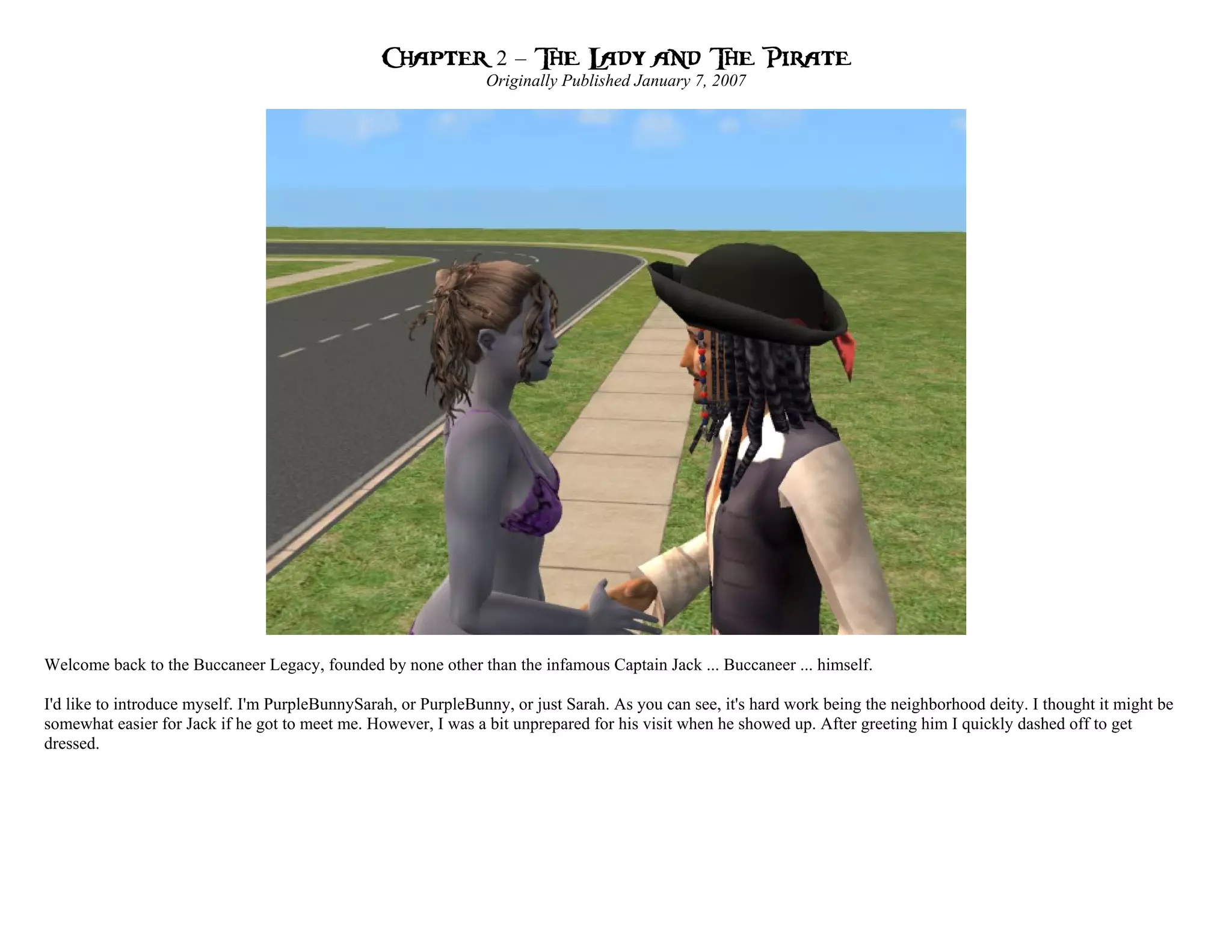 This document provides an overview of Chapter 2 of the story, introducing several characters - Captain Jack, his wife Elise, and their daughters Elisabeth and Mary. It summarizes Jack meeting the neighborhood deity PurpleBunnySarah, then returning home as Elise goes into labor with their second child Mary. The chapter concludes with Jack continuing his quest to date 50 women without his wife's knowledge.