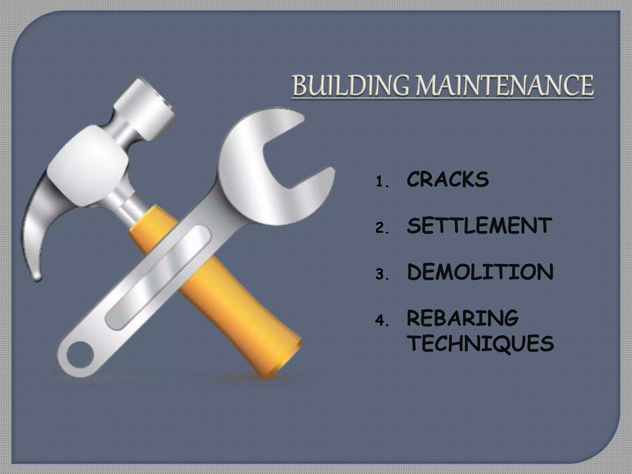 This document discusses various techniques for concrete repair, including crack repair, grouting, guniting, reinforcement, settlement issues, demolition, and rebar installation. It addresses types of cracks in concrete, how to determine if they are moving or non-moving, and repair methods like grouting. It also covers using guniting to rehabilitate structurally distressed reinforced concrete, applying proper drainage and waterproofing at plinth level, safely demolishing structures, and installing rebar to reinforce concrete and enhance its strength against different load pressures.
