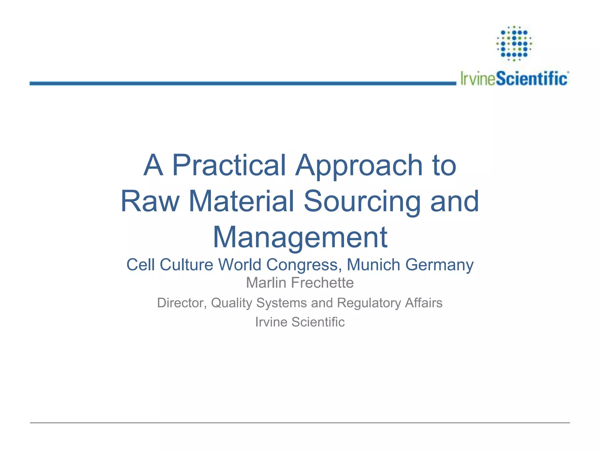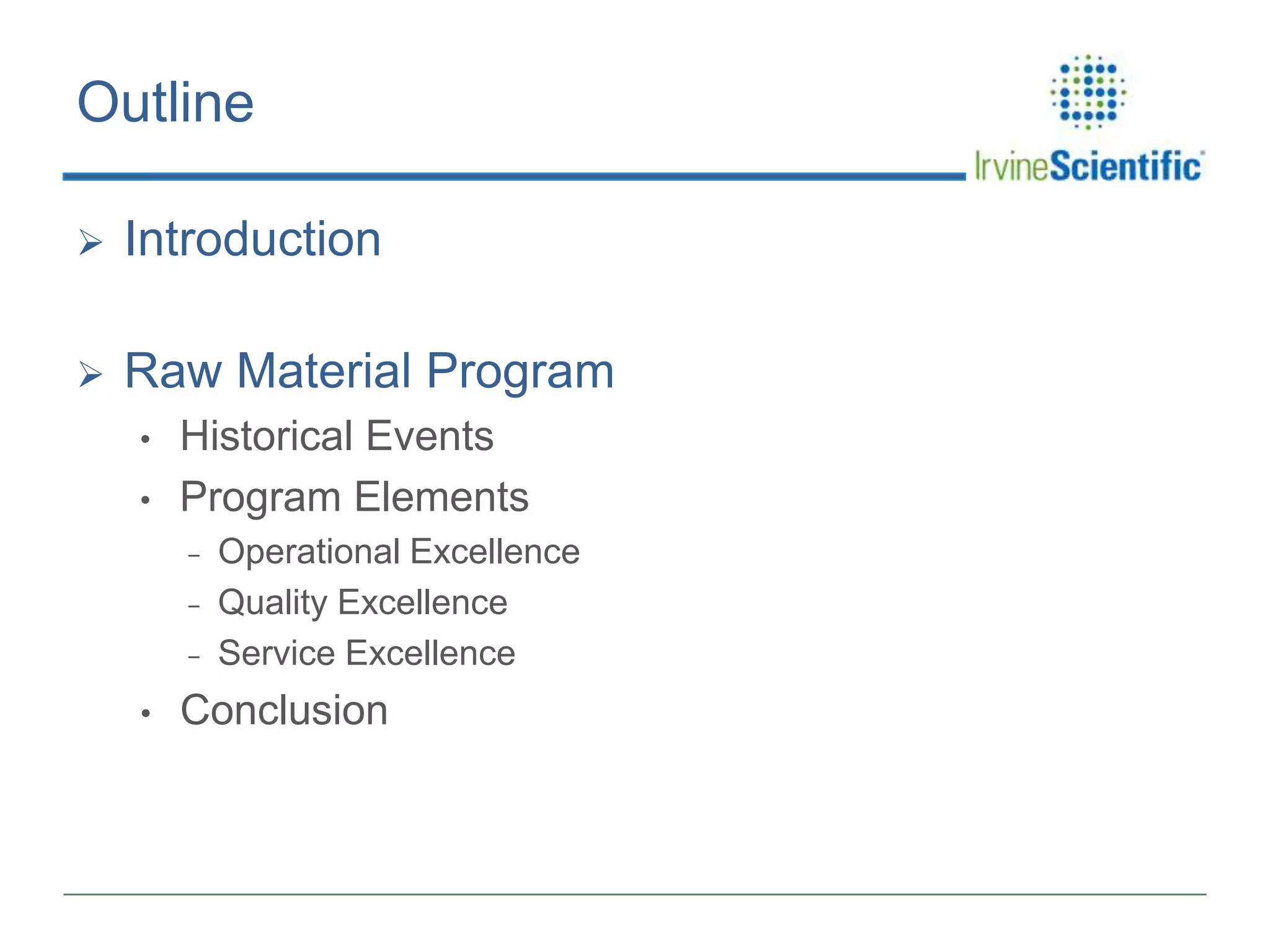 This document summarizes Irvine Scientific's raw material sourcing and management program. It discusses the company's 40-year history in cell culture, the markets it serves, and its parent company. The presentation outlines Irvine's raw material program elements, including historical events of contamination issues, operational excellence through industry best practices like dual sourcing, quality excellence through continuous improvement and analysis, and ensuring service excellence through seamless integration of custom customer needs. It concludes that the program aims to align with industry expectations through a practical risk-based management approach and ensure successful execution through business continuity.
