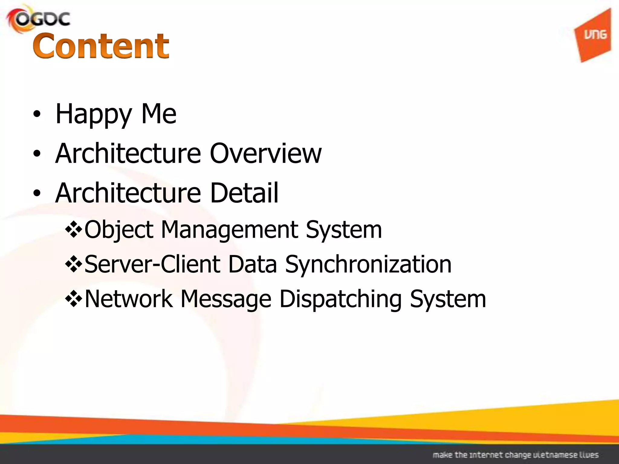 This document summarizes an architecture for a multiplayer online game. It includes three main systems: an object management system to organize game data, an auto synchronization framework to keep server and client data in sync, and a network message dispatching system for server-client communication. It was developed over 12 months by a team of 3 system developers and 4 game developers to support a room-based social game with a web-based Unity3D client.