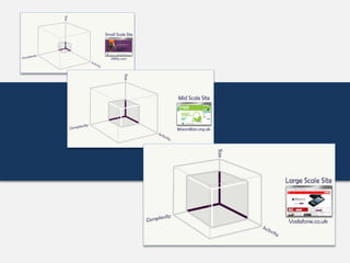 The document outlines a practical model of web governance, defining it as the management of websites through governance activities and resources. It introduces the concept of website scale, which includes size, busy-ness, and complexity, to help organizations measure and compare their web governance needs. Additionally, it discusses team structure and manpower requirements as they evolve with the scale of the site, emphasizing the importance of expertise and organized roles in effective web governance.
