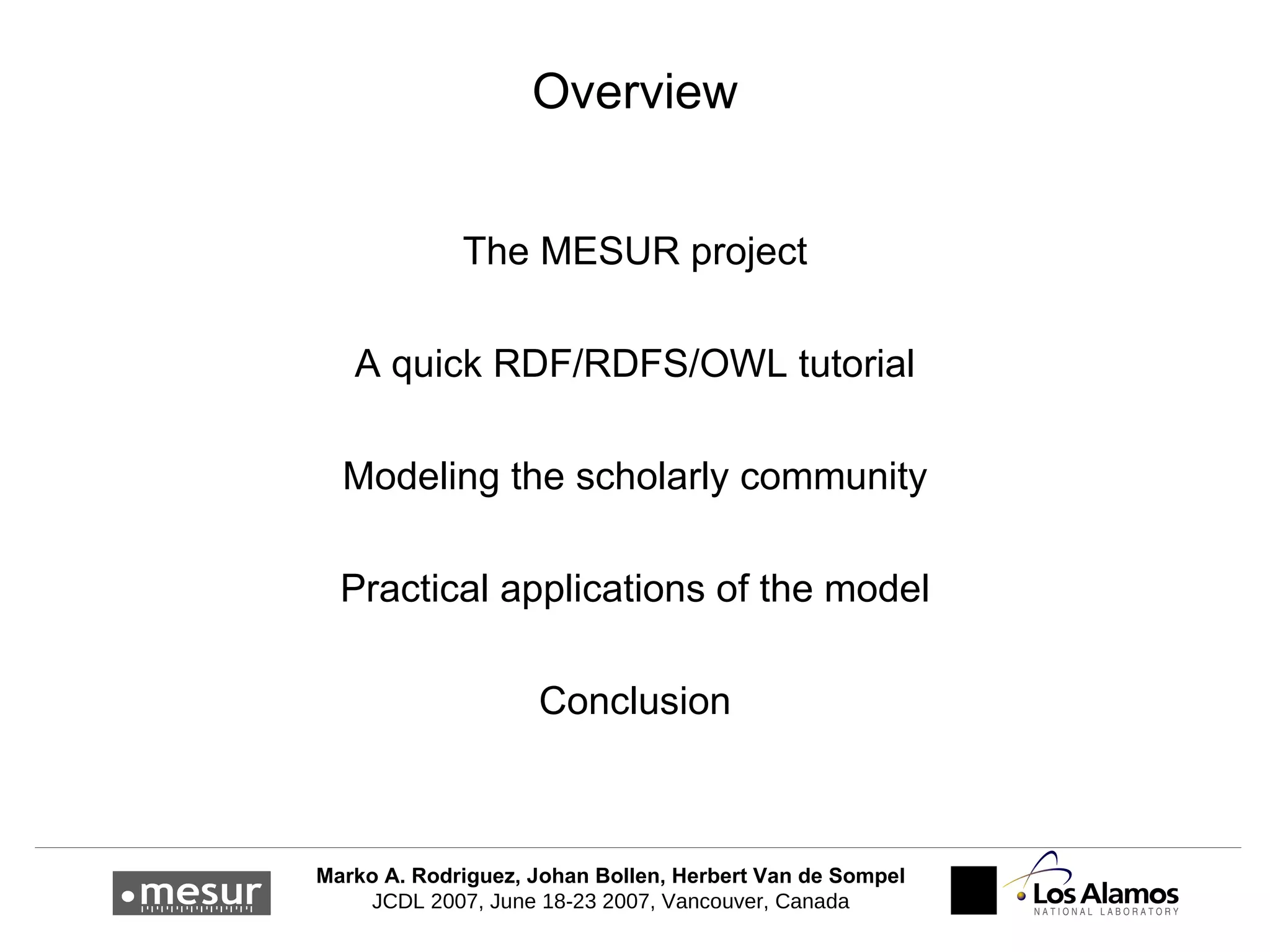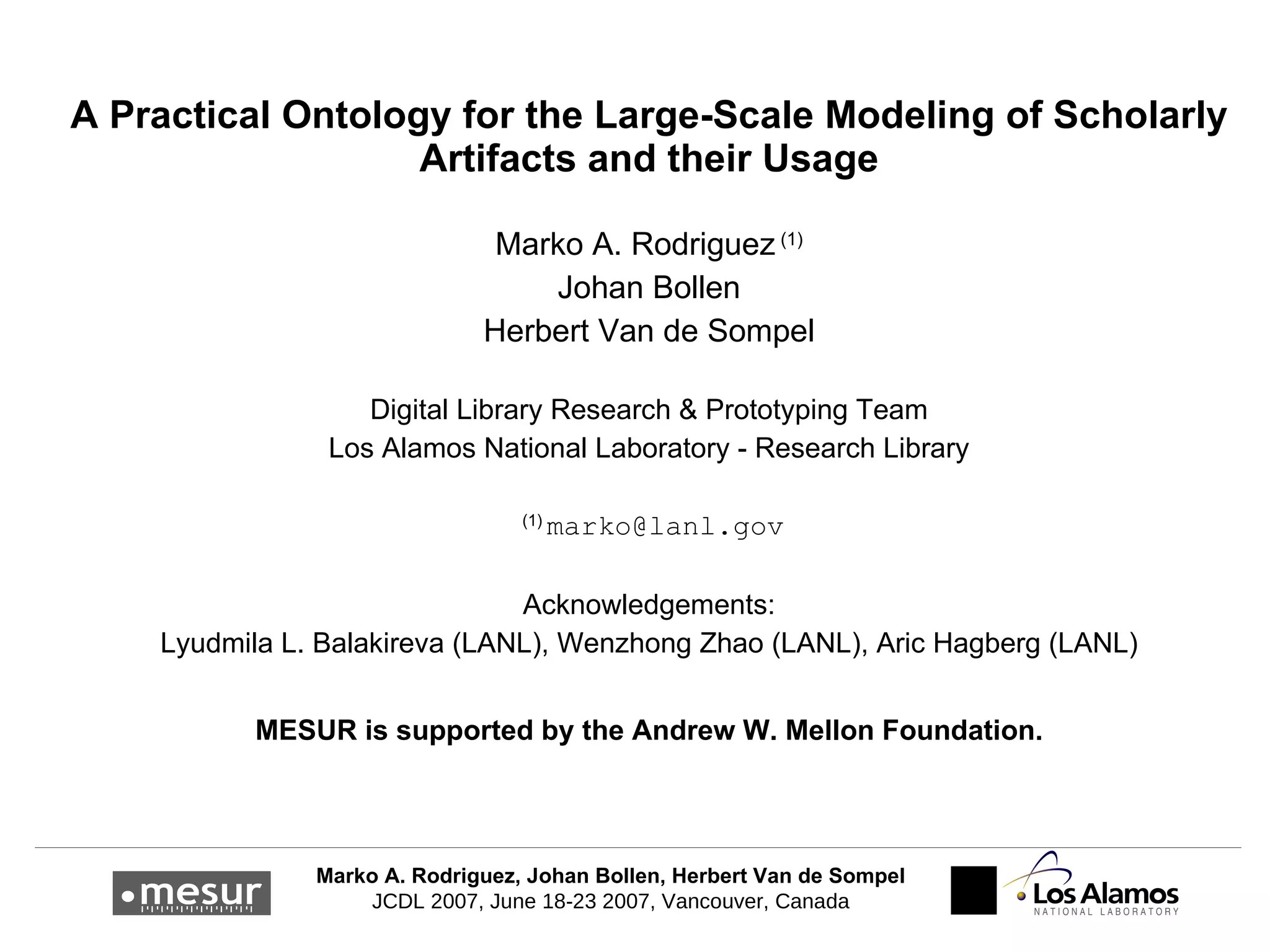 The MESUR project aims to create a comprehensive model of scholarly artifacts by gathering publication, citation, and usage data worldwide, utilizing a semantic network for data representation. It leverages relational database and triple store technologies to manage the large datasets effectively, focusing on relationships over detailed metadata. The project supports the scholarly community by providing open-source ontologies that reflect the publication, citation, and usage dynamics in research.