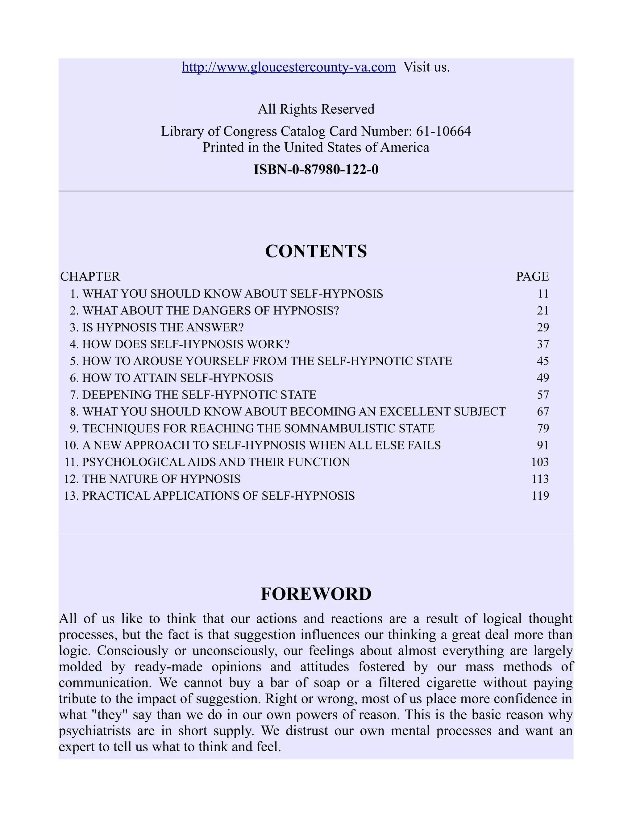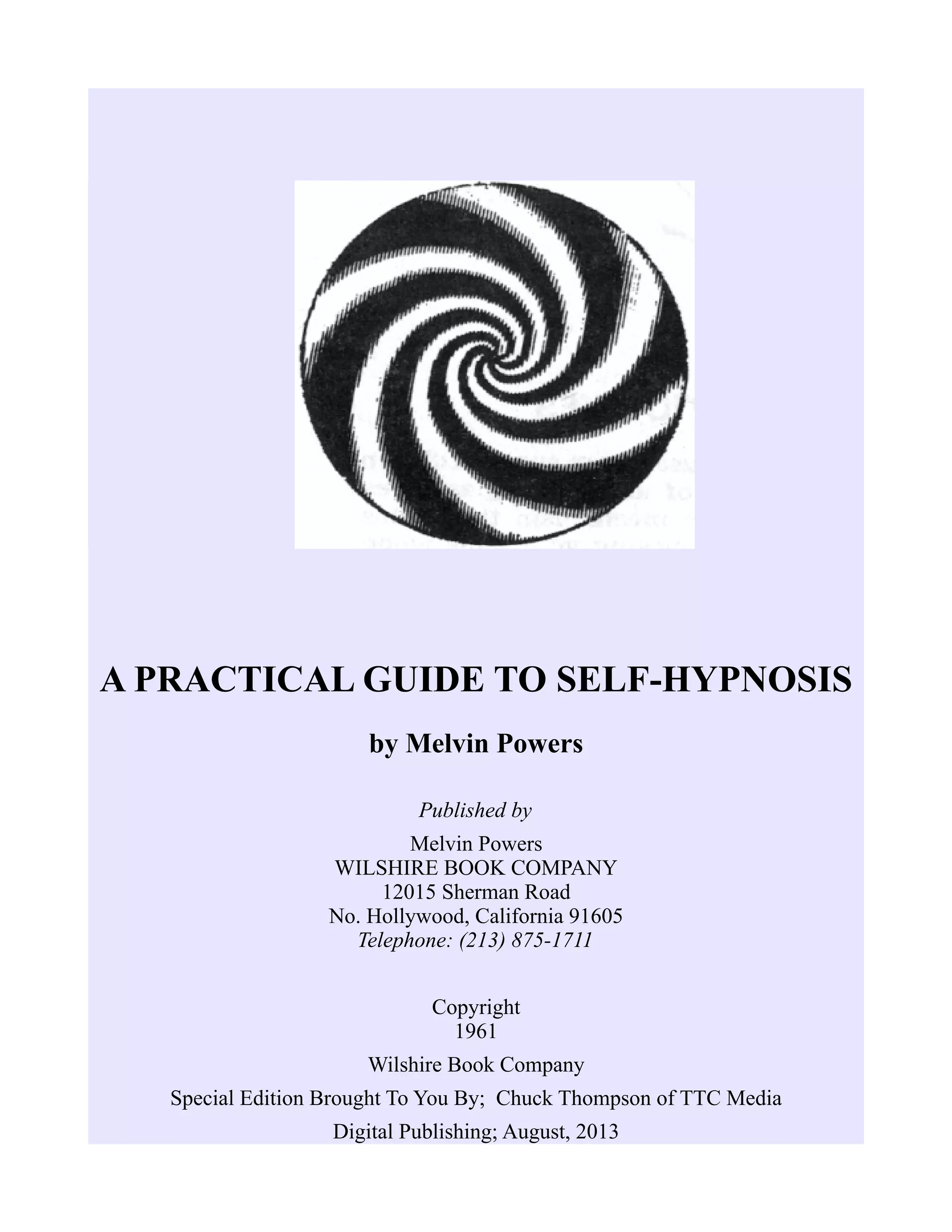 This document is a practical guide on self-hypnosis by Melvin Powers, discussing its mechanics, benefits, and the significance of suggestion in influencing behavior. It emphasizes that self-hypnosis enables individuals to harness their suggestibility for self-improvement and that the process varies for each person. The book aims to equip readers with the knowledge and techniques for effectively practicing self-hypnosis to enhance their emotional and physical well-being.