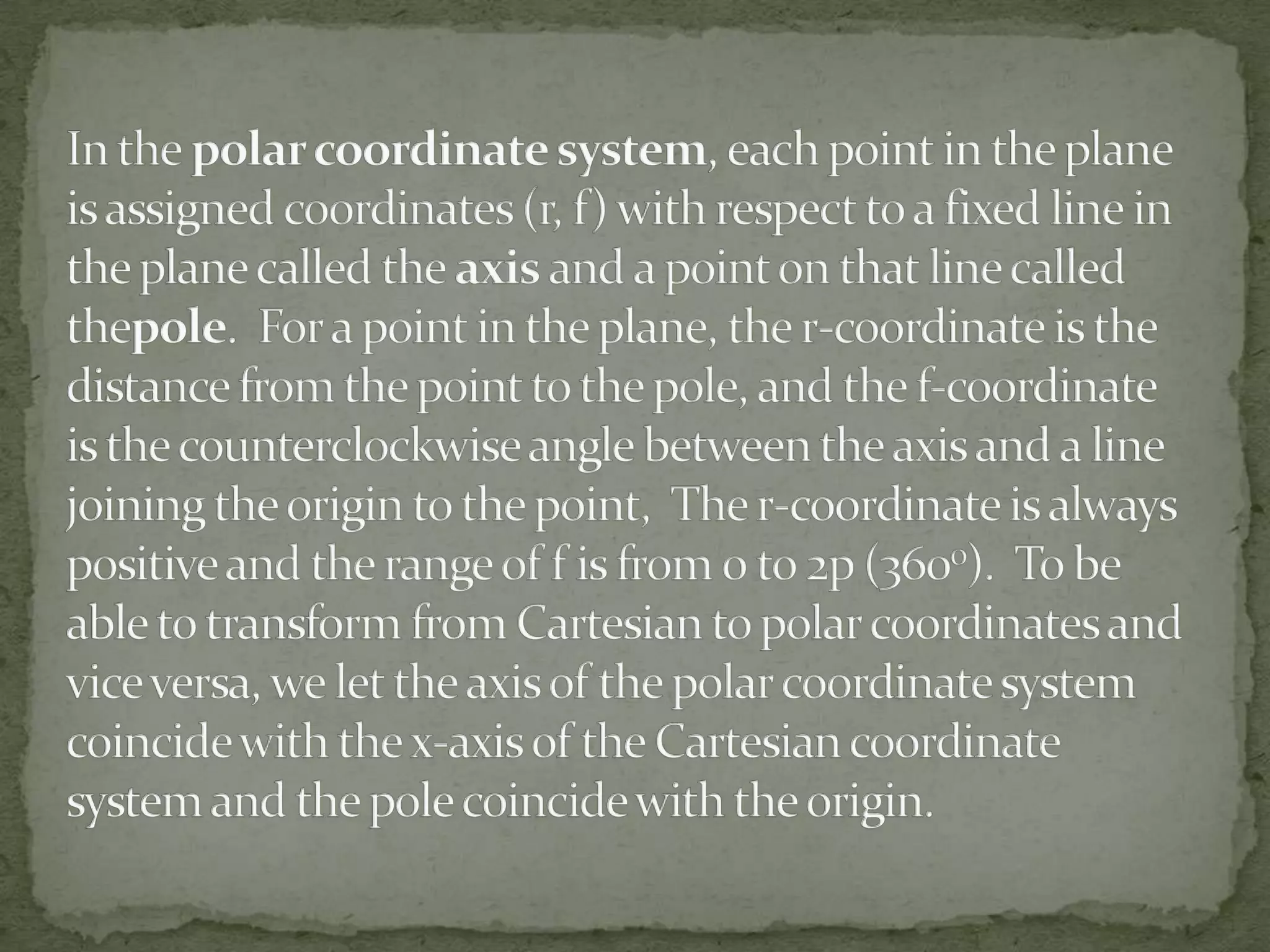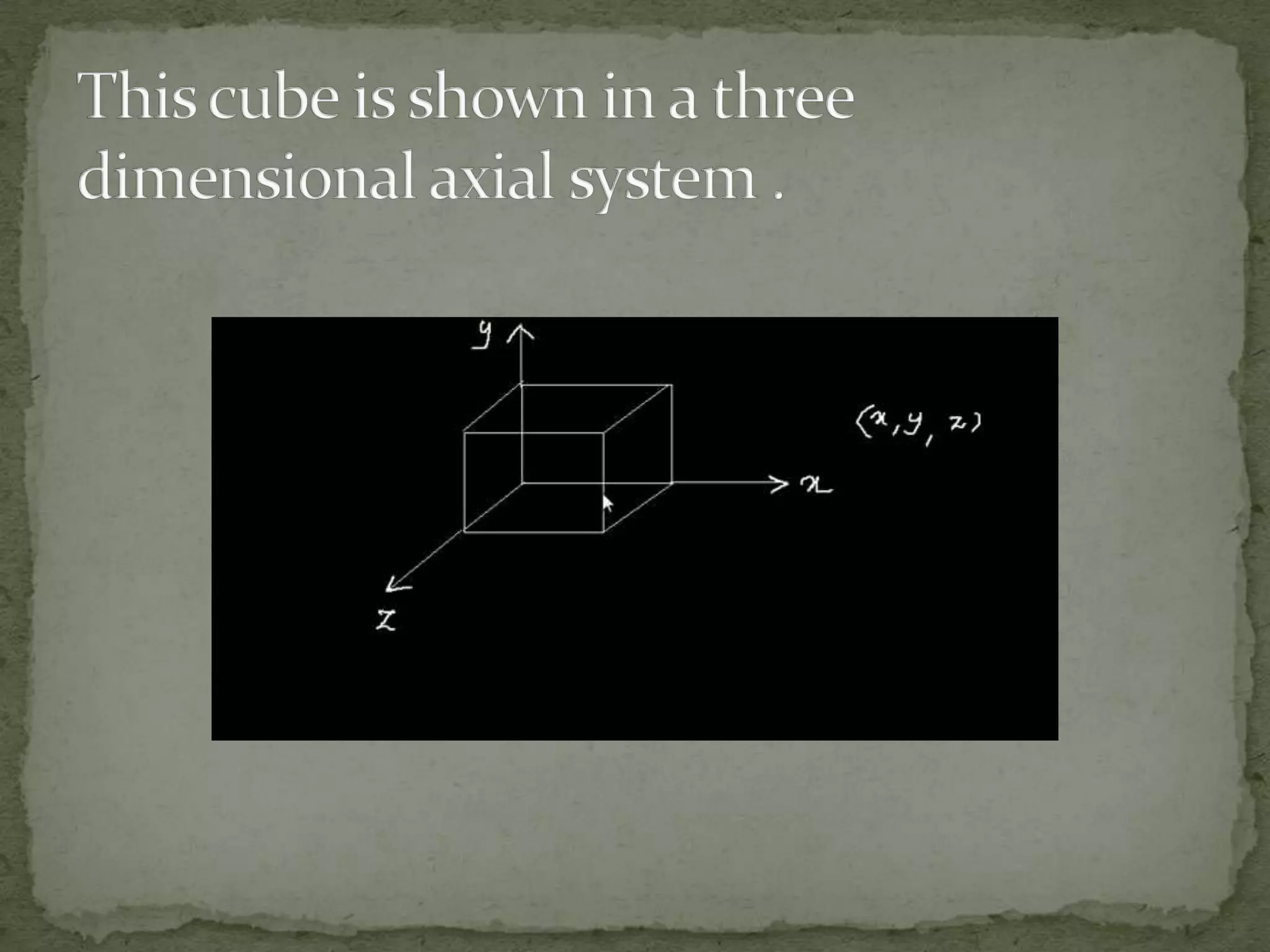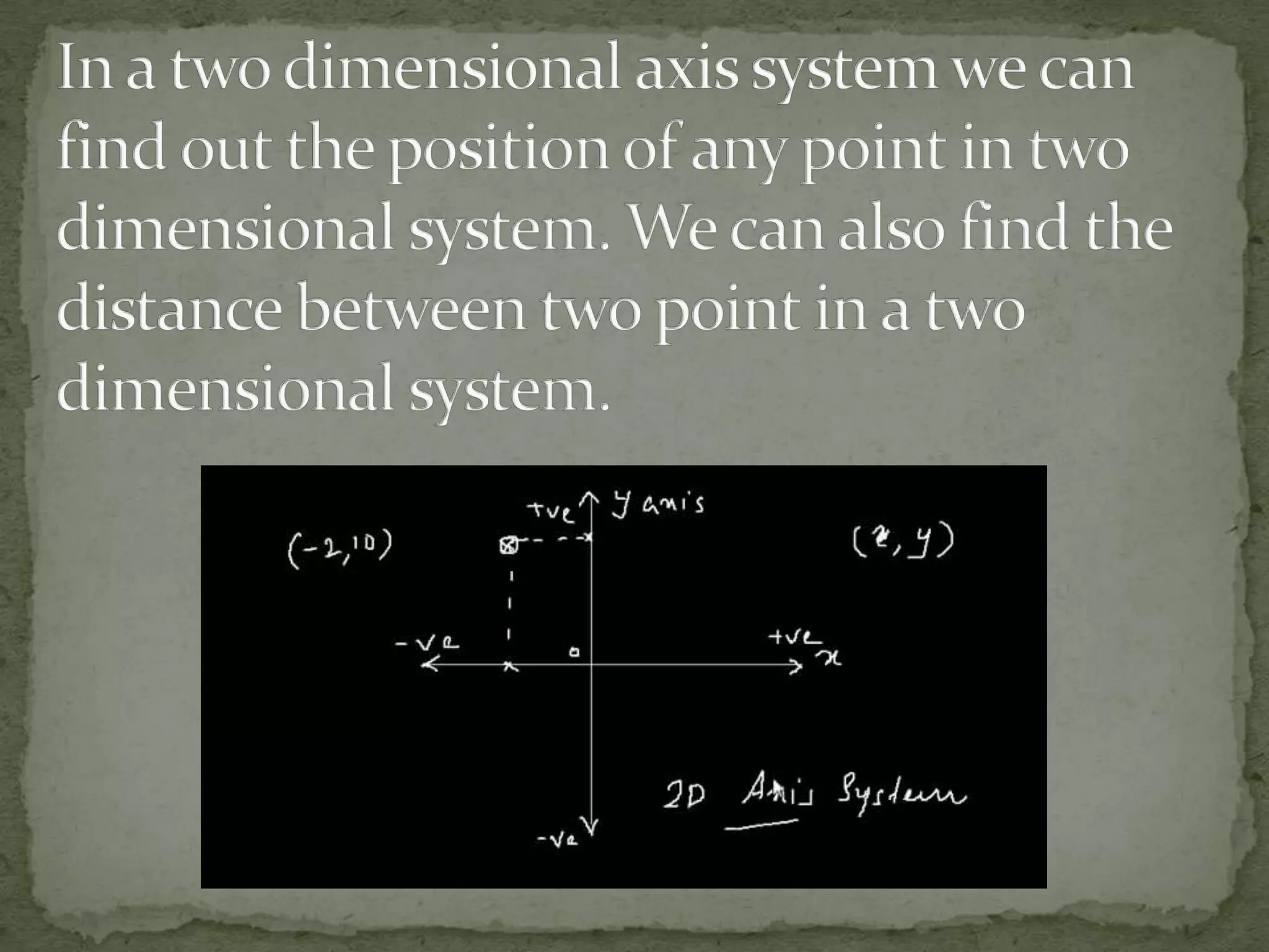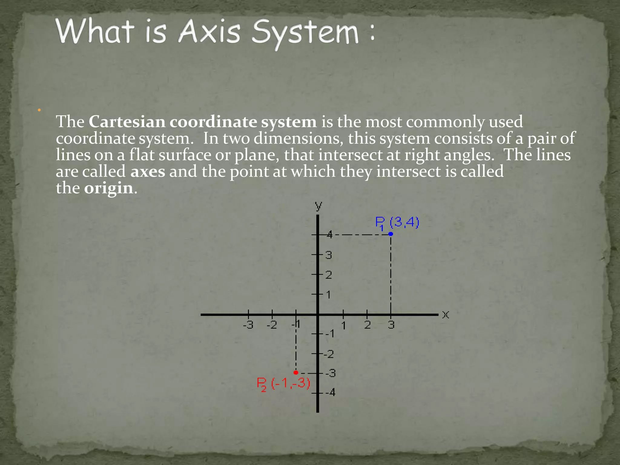 This document discusses different coordinate systems including Cartesian, polar, cylindrical, and spherical coordinates. It explains that the Cartesian system uses perpendicular axes that intersect at right angles, with one point defined as the origin. Polar coordinates represent a point using its distance from the origin and the angle from the x-axis. The document also describes how the axial system is used to find distances between points and know positions relative to the axes in different dimensional systems.
