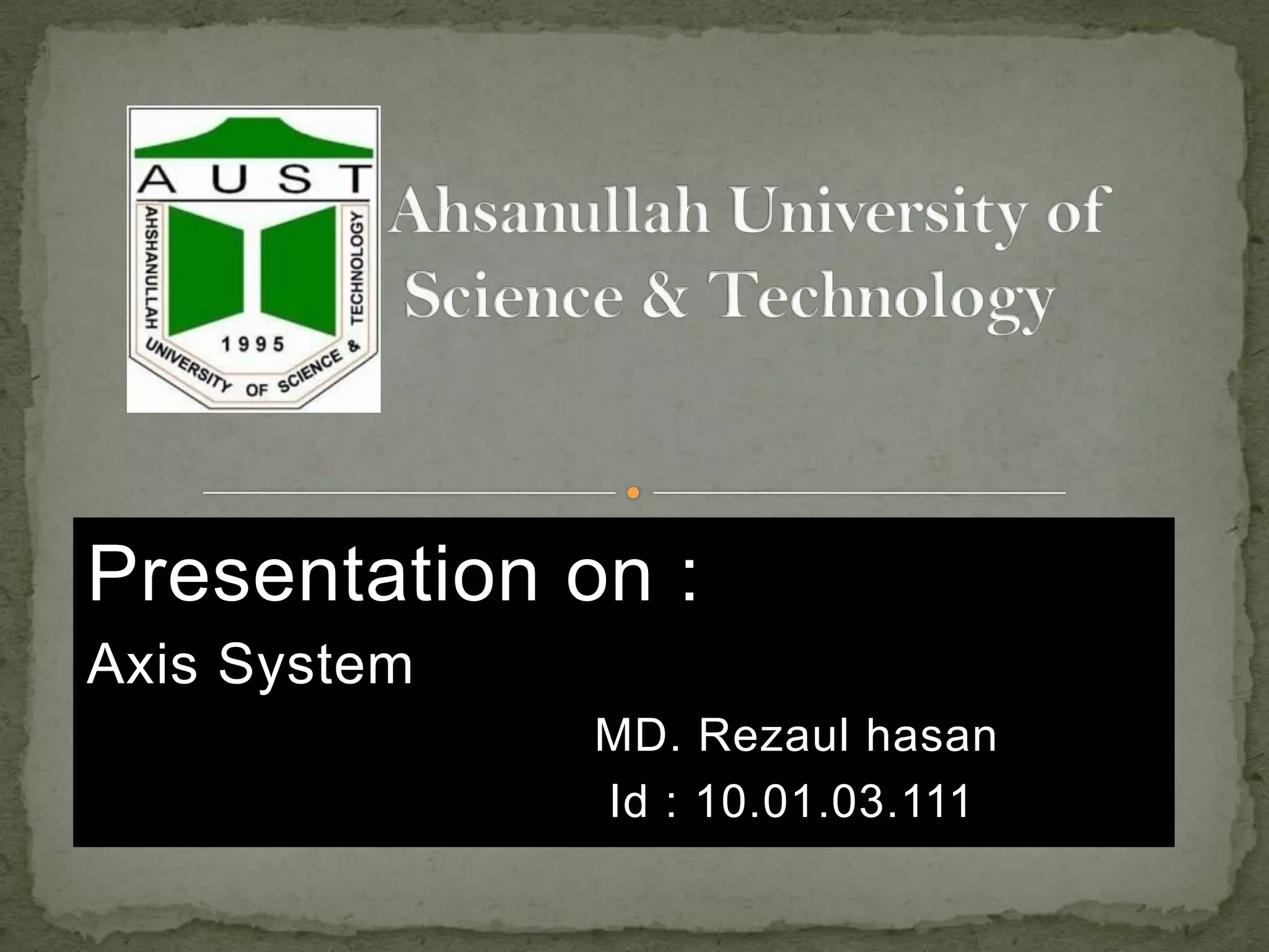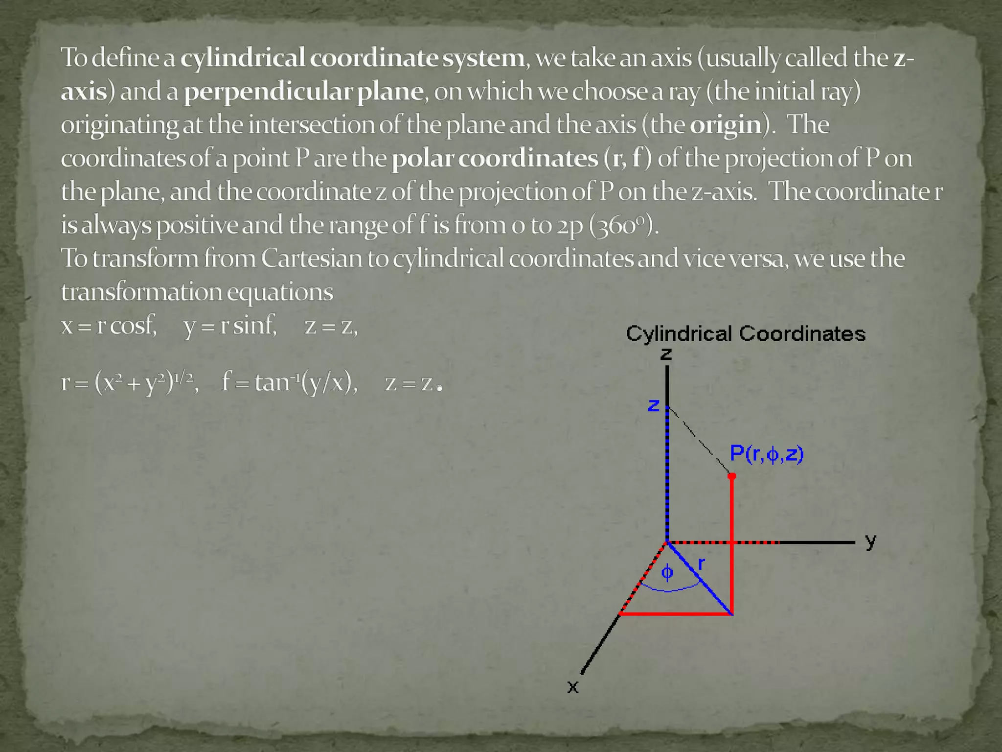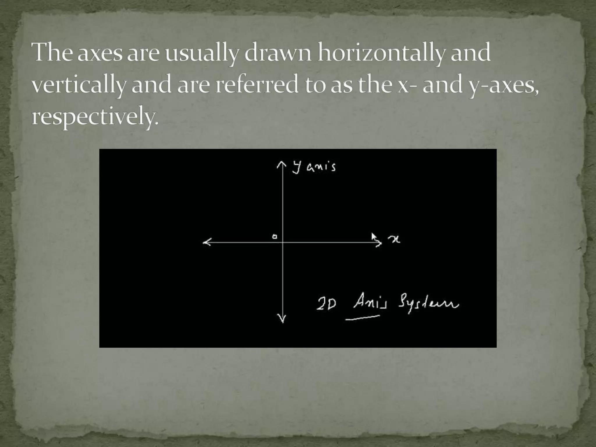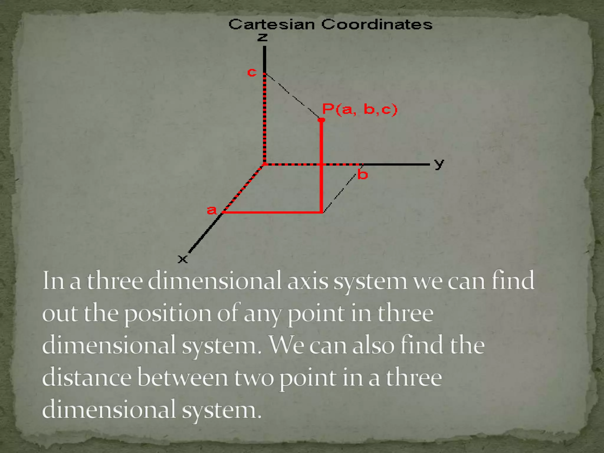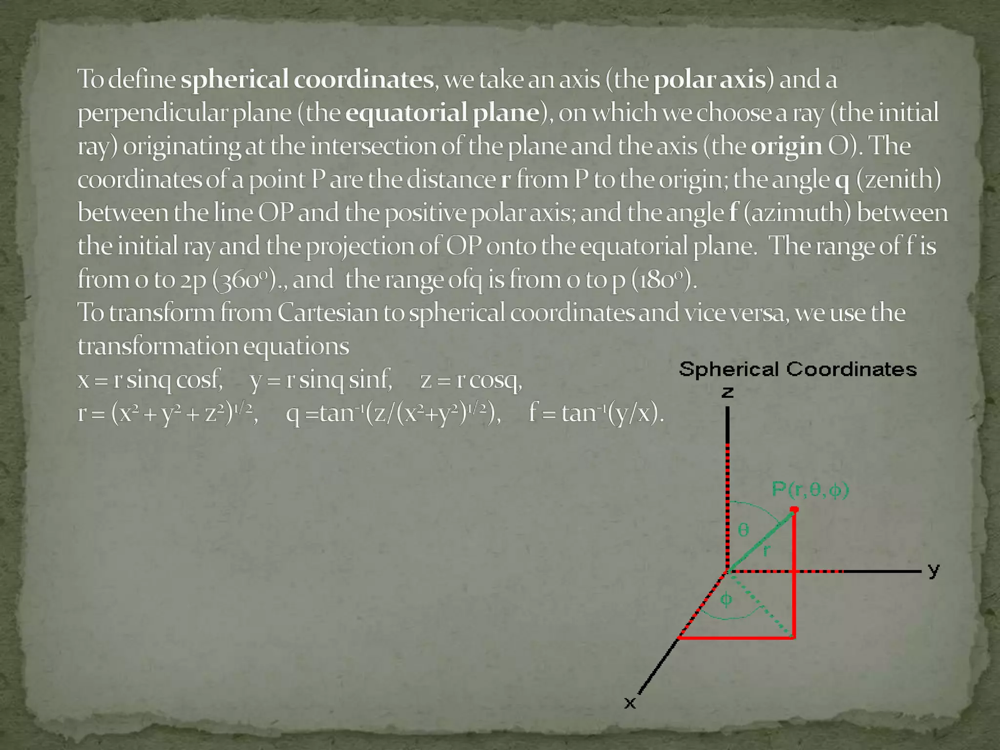 This document discusses different coordinate systems including Cartesian, polar, cylindrical, and spherical coordinates. It explains that the Cartesian system uses perpendicular axes that intersect at right angles, with one point defined as the origin. Polar coordinates represent a point using its distance from the origin and the angle from the x-axis. The document also describes how the axial system is used to find distances between points and know positions relative to the axes in different dimensional systems.