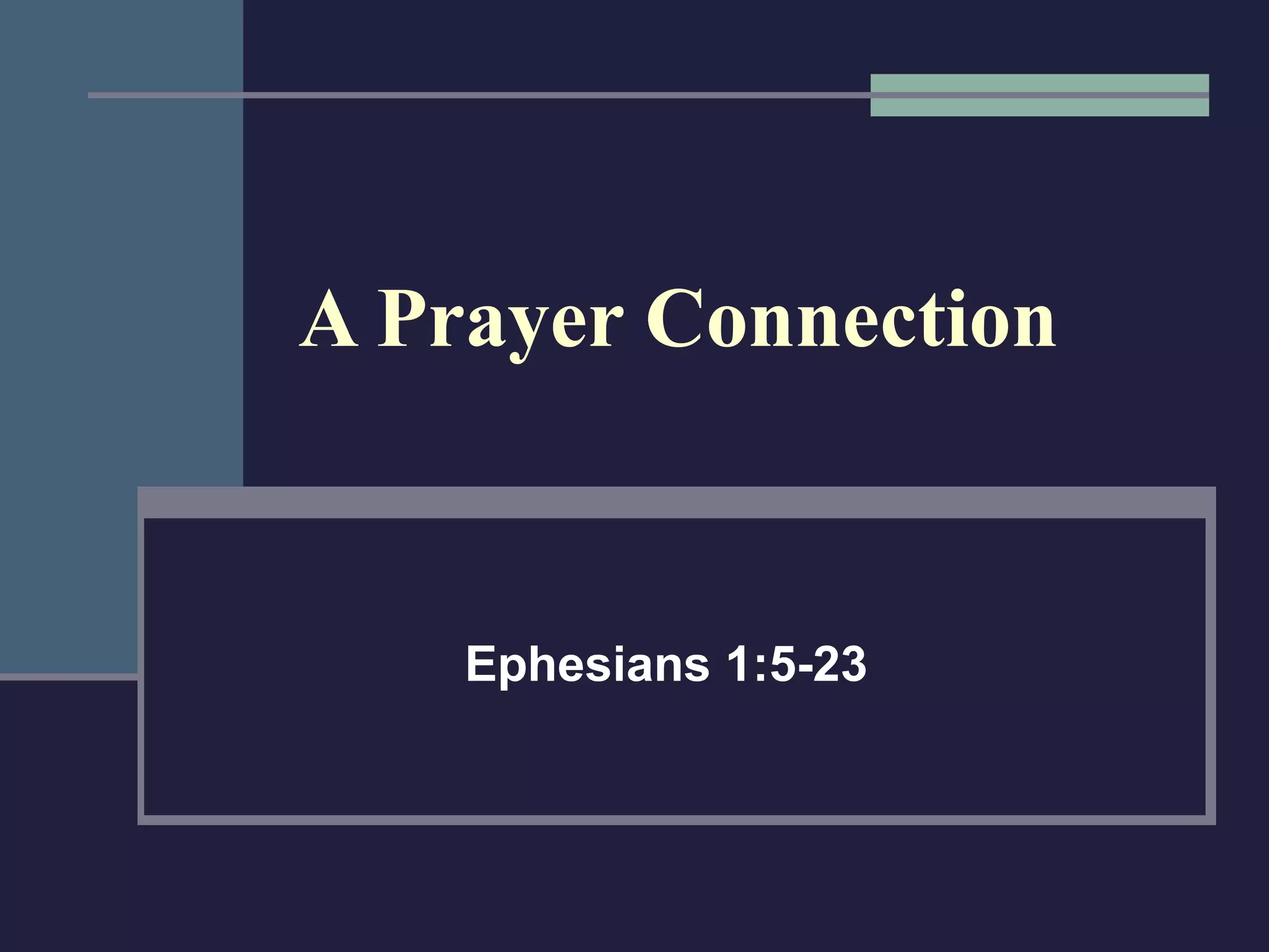 The document discusses the importance of prayer based on Ephesians 1:5-23. It summarizes that Paul prays for believers to gain wisdom and revelation so they understand God's plan, power, and their role as God's partners. The document also provides quotes about prayer and encourages readers to pray continually to know Christ and fulfill God's purpose.