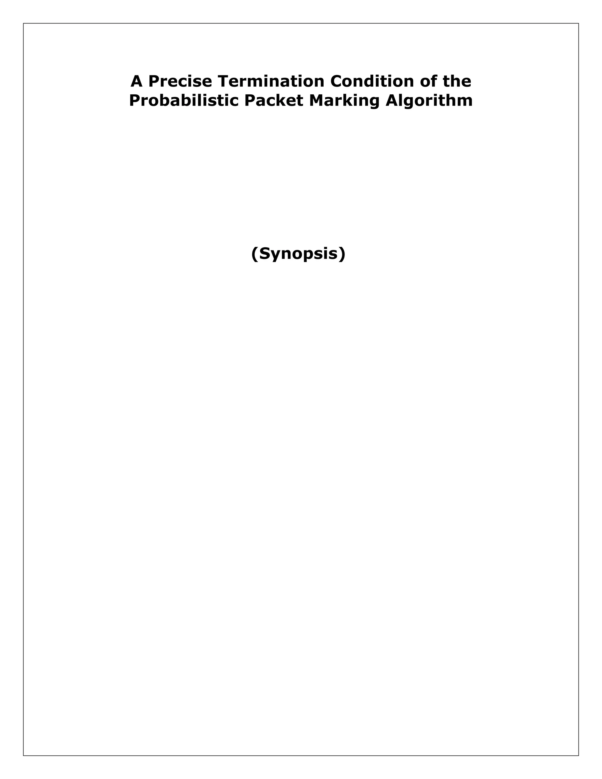 This document summarizes a research project that proposes a precise termination condition for the probabilistic packet marking (PPM) algorithm. The PPM algorithm allows routers to encode path information onto packets during a denial of service (DoS) attack, enabling the victim to reconstruct the attack graph. However, the existing PPM algorithm lacks a well-defined termination condition, and cannot handle multiple attackers. The proposed project aims to define a termination condition to ensure the reconstructed graph accurately represents the actual attack paths. It also extends the algorithm to support tracing packets from multiple attackers.