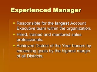 Michael Gonzalez is a polished relationship and business development professional with 20 years of experience in sales and management within the payment services industry. He has a track record of exceeding sales quotas by 50% and ranking in the top 20% of national sales forces. Gonzalez is also an experienced manager who has trained and mentored sales professionals, achieving honors for exceeding district goals by wide margins. He maintains strong customer relationships and receives positive references from colleagues and clients.