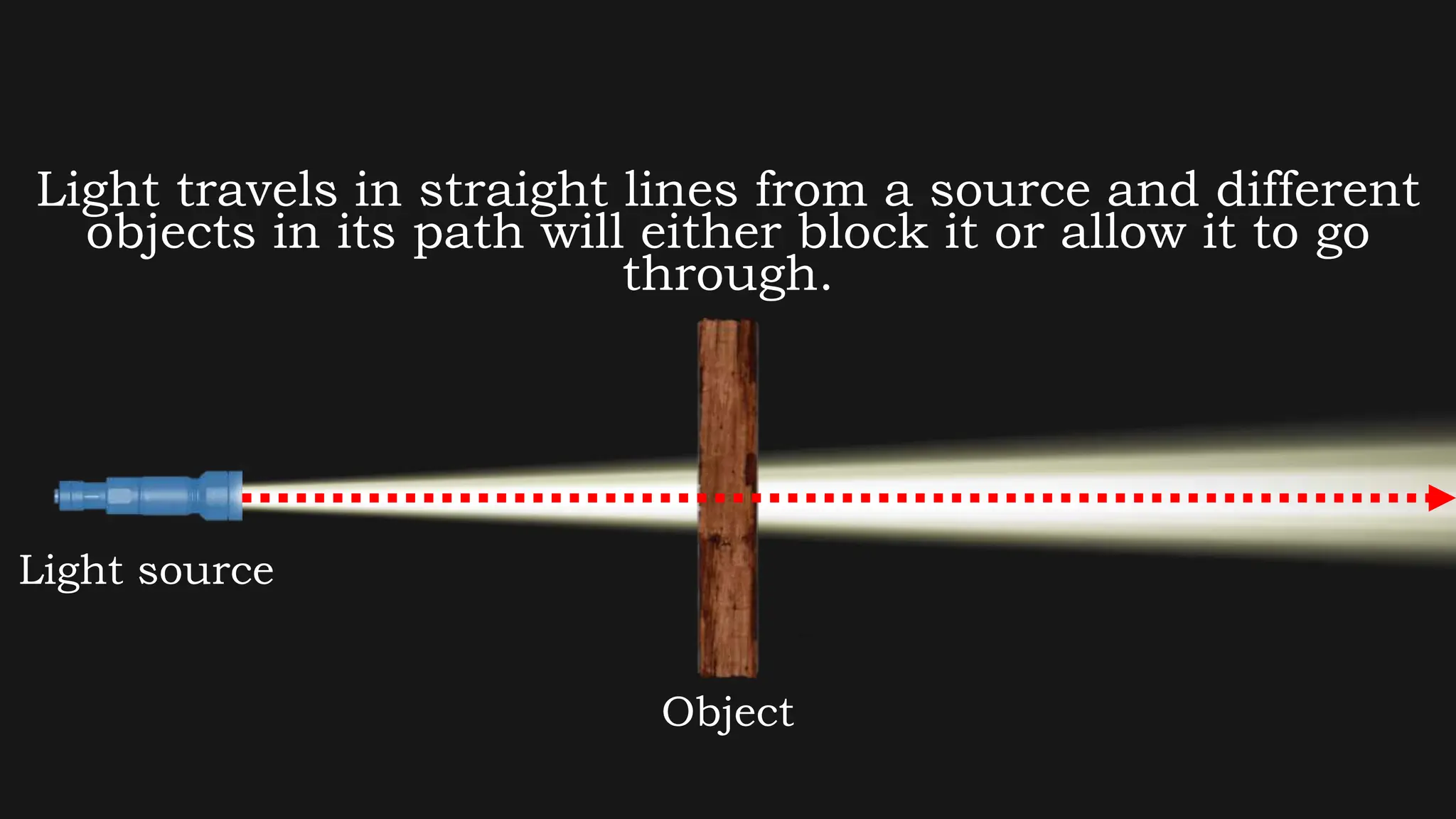 Light travels in straight lines from a source, and objects in its path will either allow light to pass through completely (transparent), partially (translucent), or block it completely (opaque). Transparent objects like clear glass and water allow all light to pass through, translucent objects like frosted glass and plastic bags allow some light, and opaque objects like books and cardboard block all light.