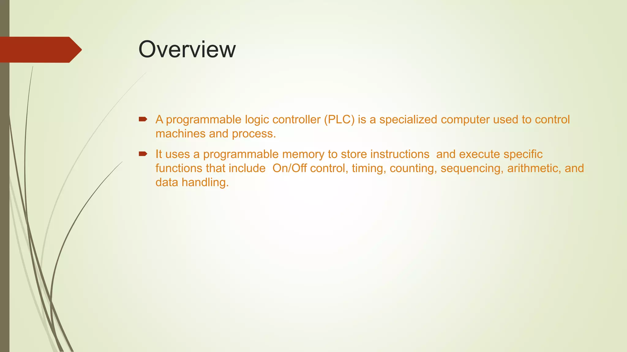 This document presents a programmable logic controller (PLC) system for controlling two conveyor belts. It includes an overview of PLCs and their components like the processor. It then provides a problem statement to design ladder logic to control two conveyor belts based on conditions like starting on a start button press and proximity sensors detecting objects. The solution section shows the ladder logic diagram and variables used, like inputs for start/stop buttons and sensors, and outputs to control the conveyor belts. It describes the logic flow of starting the first belt when started, counting objects with a counter, and starting the second belt when the count reaches 5 while stopping the first belt, then repeating by restarting the first belt once 5 objects pass the