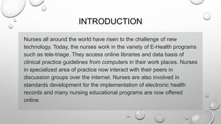 The document discusses e-nursing/e-learning in nursing. It defines e-nursing as using computers or electronic devices to provide training, education and learning materials. It discusses the goals of e-nursing as enhancing nursing skills and outcomes. It outlines different styles and forms of e-learning, including asynchronous learning like email/forums and synchronous learning like video calls. The benefits are discussed as flexibility, cost-effectiveness, and standardized delivery. Challenges include lack of IT skills and isolation. Overall, the document promotes e-learning as an effective way to support nursing education and development.
