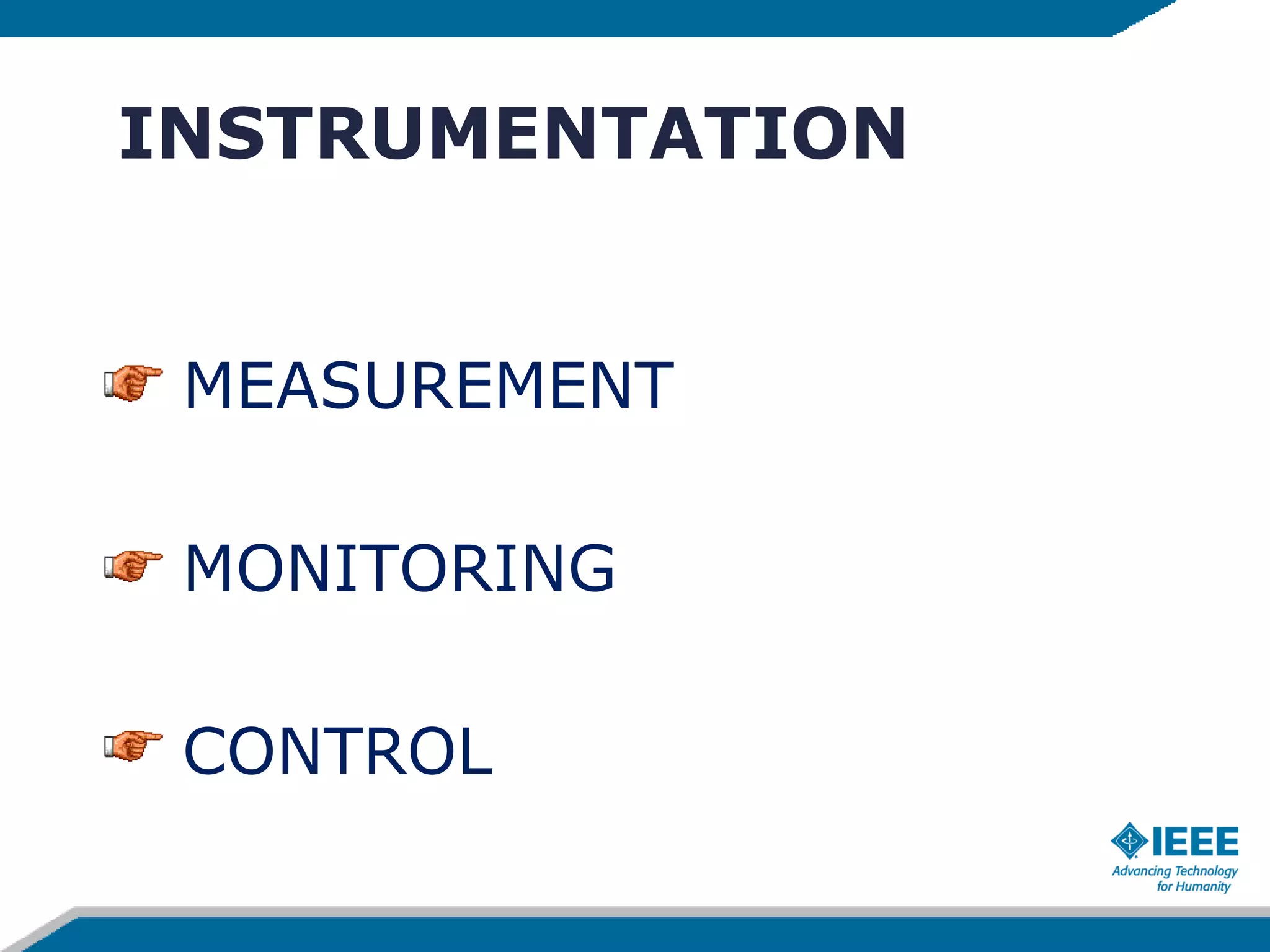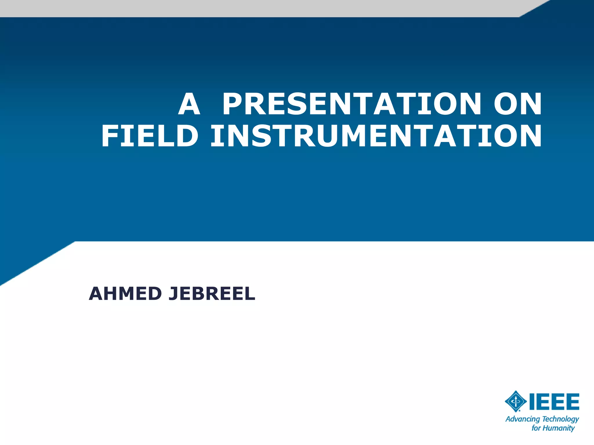 This document provides an overview of field instrumentation used for measurement, monitoring, and control. It discusses common process variables like flow, pressure, temperature, and level. It then focuses on different types of flow measurement instrumentation including positive displacement meters, head meters, velocity meters, and mass meters. Specific flow meter types are described in detail like orifice plates, venturi tubes, rotameters, turbine meters, electromagnetic flow meters, vortex meters, and ultrasonic flow meters. Advantages and disadvantages of each type are presented.