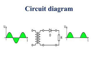 A half wave rectifier is an electrical device that converts alternating current (AC) into direct current (DC) by allowing either the positive or negative half of the AC waveform to pass through, which results in a unidirectional but pulsating output. This process requires a single diode for single-phase systems, and produces significant ripple, necessitating further filtering to eliminate harmonics. The basic circuit includes a diode, transformer, load resistor, and additional components such as capacitors for smooth output.