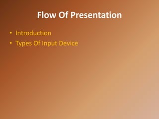 This presentation introduces various computer input devices. It begins with an introduction that explains input devices allow users to enter data and instructions into a computer by converting them into a format the computer can understand. The main part describes several common input devices: keyboards, mice, joysticks, and digital cameras. For keyboards, it covers standard, multimedia, and wireless keyboards. For mice, it discusses serial, optical, and wireless mice. Joysticks are described as pointing devices used for game controls. Digital cameras are presented as vision input that converts images into digital form for computer interpretation.