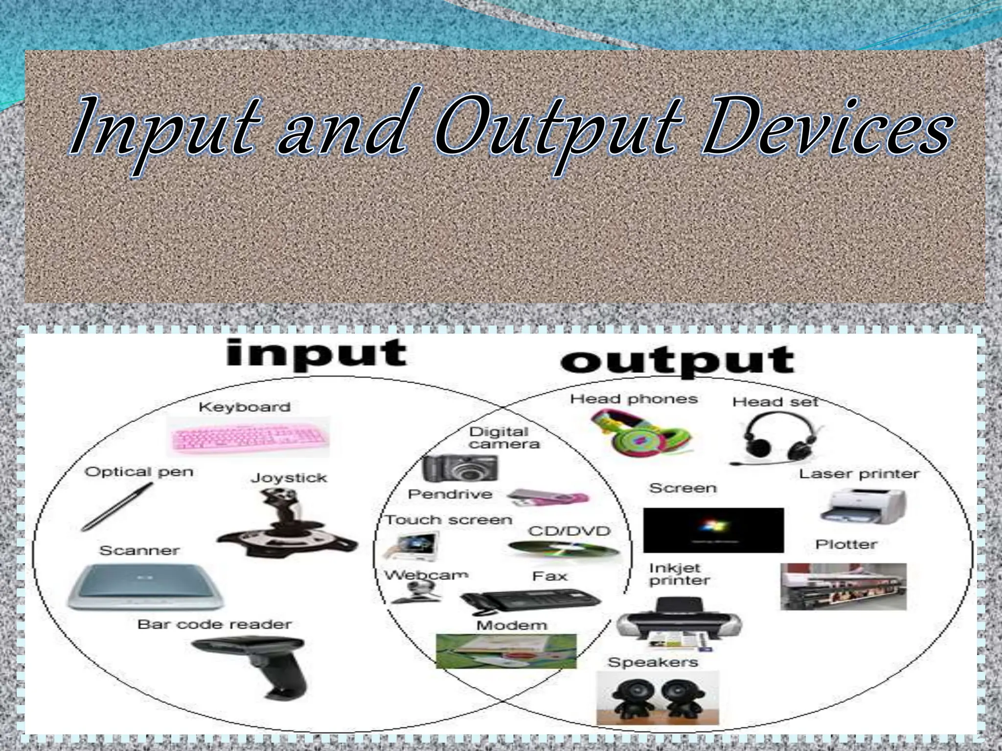 The document provides a comprehensive overview of input and output devices used in computers, detailing their definitions, types, and functionalities. Key input devices discussed include keyboards, mice, and scanners, while output devices such as monitors, printers, and projectors are also covered. Additionally, it mentions combination devices that handle both input and output, such as fax machines and terminals.