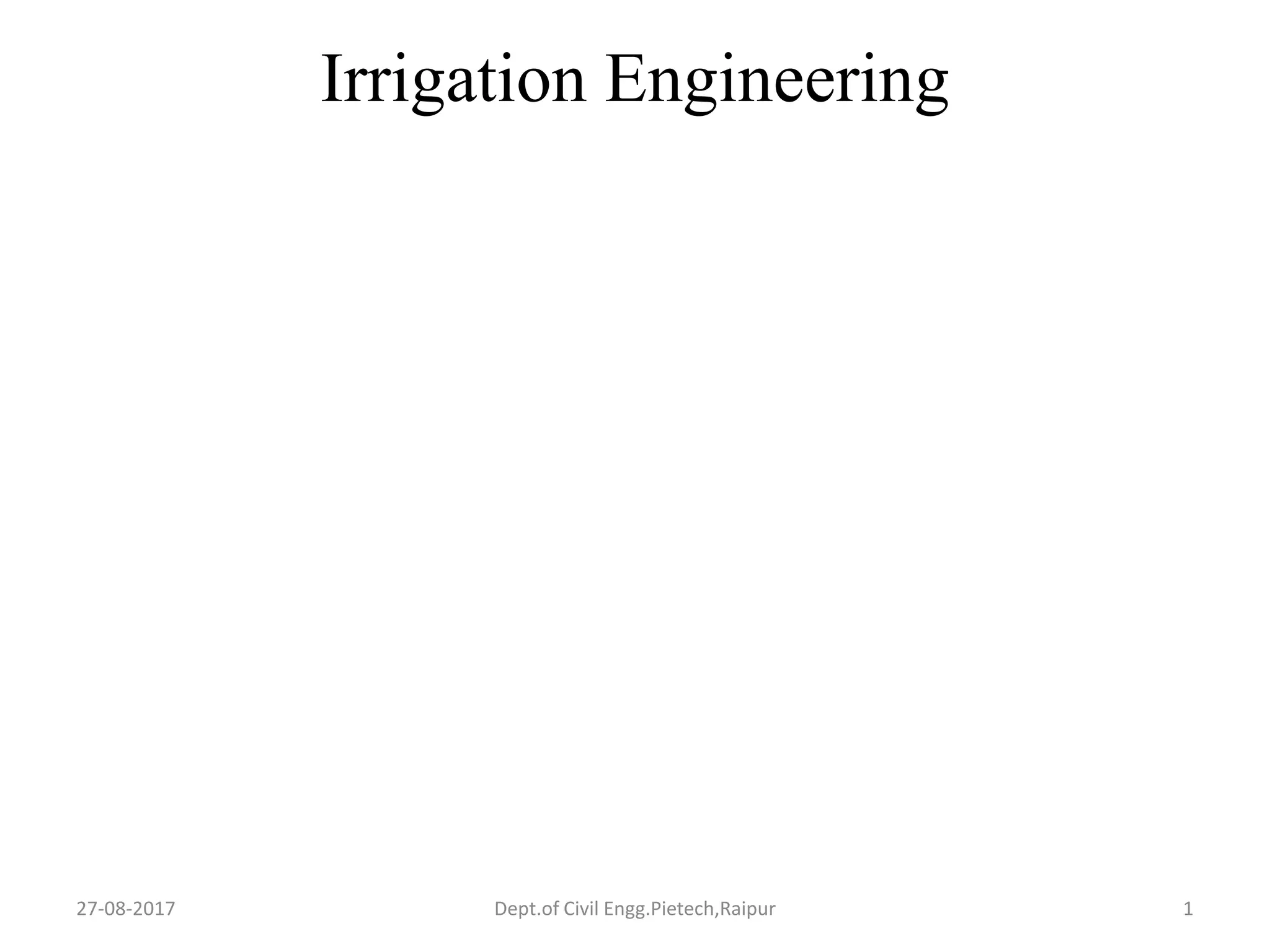 The document discusses irrigation engineering, its importance in agriculture, and various irrigation systems and methods. It covers the necessity of irrigation in India, its historical development, and classification of irrigation projects. Additionally, it explains key concepts related to crops' water requirements, soil-water relationships, and factors affecting irrigation efficiency.